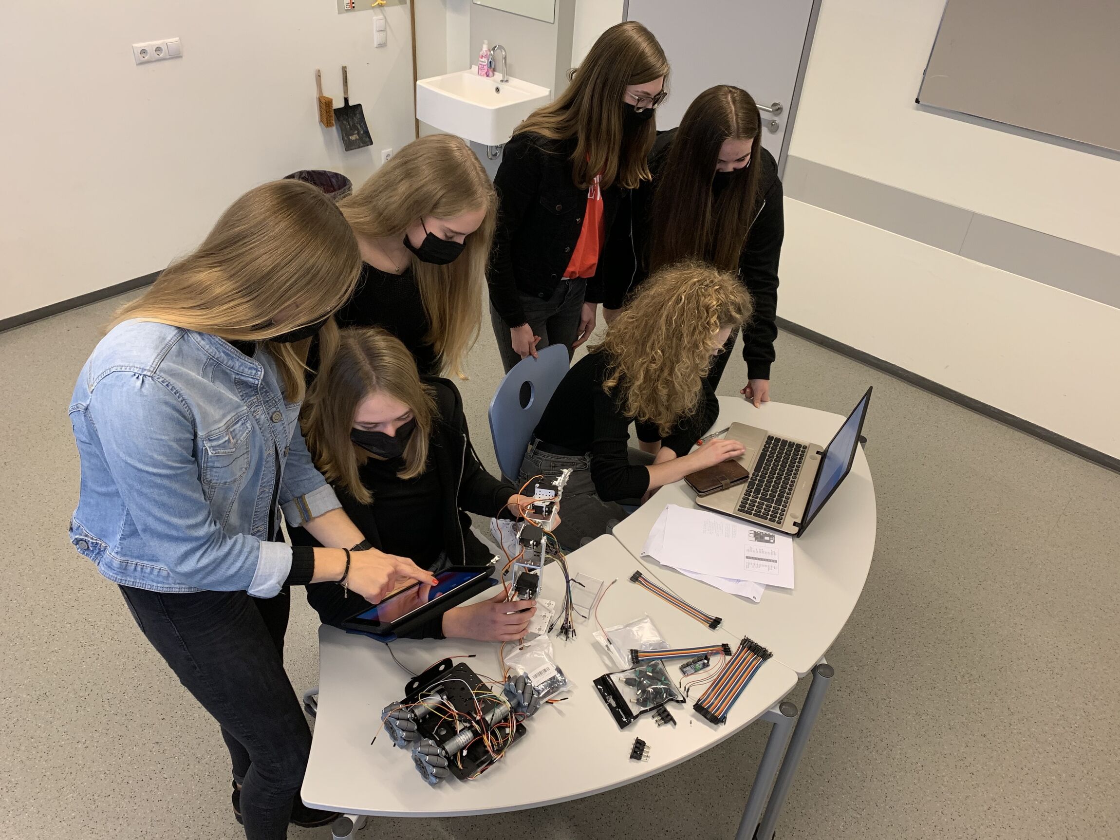 Die sieben Schülerinnen des Evangelischen Gymnasiums Nordhorn Gina Nyhoegen, Greta Röcker, Lilly Spiekermann, Sina Keuter, Marie Esders Zoe Heinen (alle Jahrgang 10) und Luise Hallfarth (Jahrgang 11) entwickeln im Rahmen des MINT-EC-Profil- und EIS-Unterrichts (Engagement in Schule) ein Funktionsmodell einer nachhaltigen und innovativen Industrie 4.0 Anlage, welche KI-Aspekte beinhaltet.