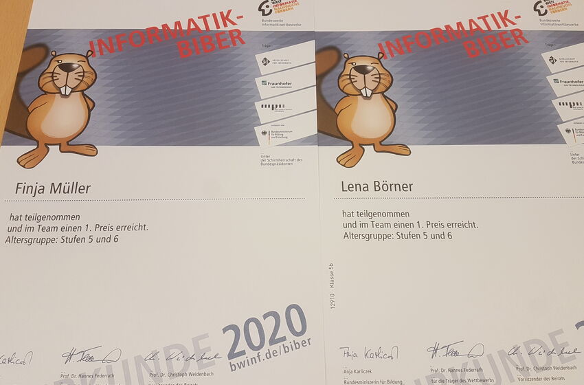 Lara Vennegerts gratuliert den 5-klässlerinnen Finja Müller und Lena Börner zum 1. Platz beim Informatik Biber Wettbewerb 2020 Pünktlich zu den Zeugnissen erhalten Finja Müller und Lena Börner ...