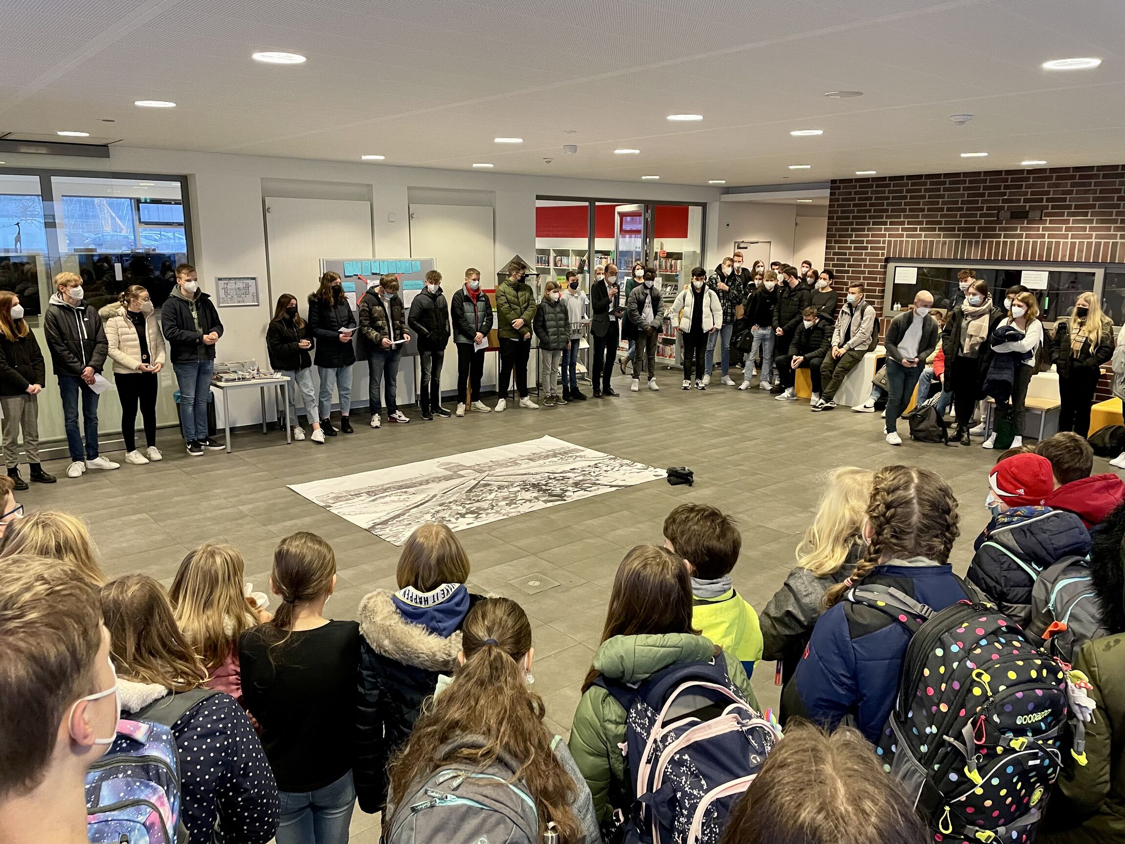 Einem jüdischen Brauch folgend, haben unsere Schüler:innen Steine abgelegt und so ihre Anteilnahme zum Ausdruck gebracht. Die 10a hat sich im Unterricht mit dem 27. Januar auseinandergesetzt und kurze Stellungnahmen verlesen, um dass eigene Gedenken sichtbar zu machen. Wir danken der 10a für die Durchführung und Marvin Weigel und Christoph Gastler für Idee und Organisation. Wir gedenken und die Erinnerung darf nicht enden. Nicht aus persönlicher Schuld, aber aus Verantwortung für uns selbst und unsere Gemeinschaft.