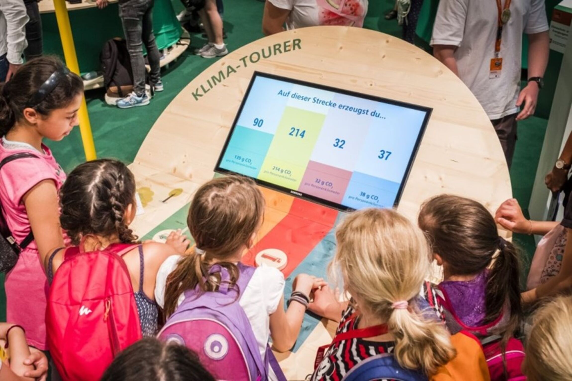 Insgesamt sechs interaktive Exponate vermitteln leicht verständlich und teilweise spielerisch die grundlegenden Zusammenhänge des Klimawandels und seiner Folgen: Der „Klima-Kenner" zeigt den natürlichen sowie den menschengemachten Treibhauseffekt. Die Besucherinnen und Besucher können negative und positive Einflussfaktoren auf den Treibhauseffekt aktivieren und sehen deren Auswirkungen. Am „Klima-Styler" geht es an mehreren Exponaten um „Fast-Fashion“ und die Auswirkungen unseres Konsumverhaltens auf Umwelt und Klima am Beispiel von Kleidung. Der „Klima-Tarier" zeigt, wie sich unterschiedliche Ernährungsweisen wie vegan oder fleischlastig auf das Klima auswirken. Auch die hohen klimaschädlichen Emissionen der globalen Lebensmittelproduktion und weitere daraus entstehenden Umweltprobleme werden thematisiert. Am „Klima-Tourer" können die Emissionen unterschiedlicher Transportmittel auf Kurz- und Langstrecken verglichen werden. Dazu gibt es Tipps, wie man im Alltag und im Urlaub klimafreundlich unterwegs sein kann. Denn gerade im Verkehrssektor, der etwa ein Viertel der energiebedingten Treibhausgasemissionen Deutschlands ausmacht, gibt es noch große Einsparpotenziale.