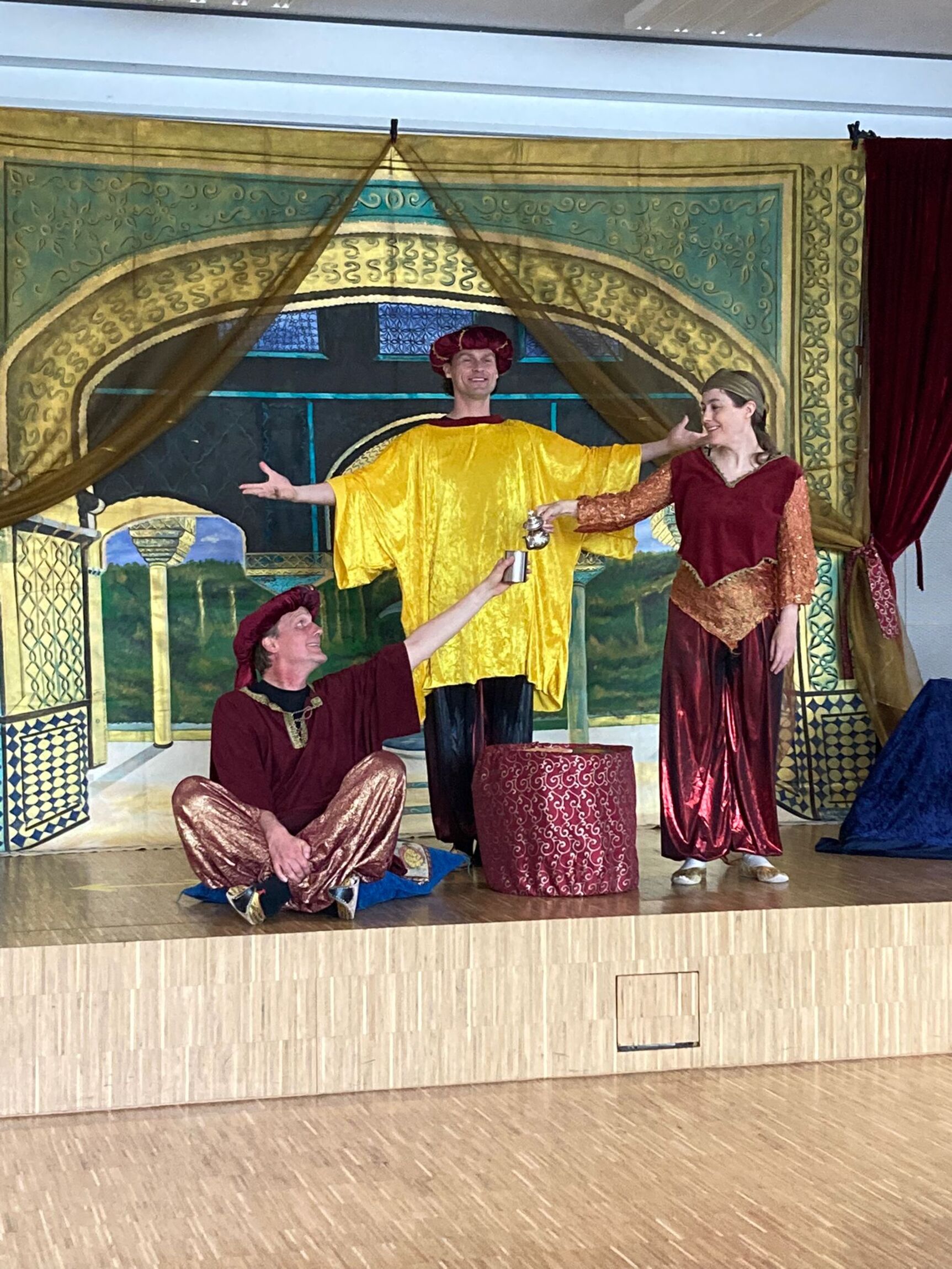 Mit gespannten Gesichtern saßen die Schülerinnen und Schüler in der Mensa des EGN und erwarteten den Auftritt. Denn am vergangenen Freitag konnten die Schülerinnen und Schüler der Jahrgänge 5 und 6 eine Aufführung der Jungen Oper genießen. Mit Witz und großartigem Gesang, tollen Kostümen und einem bunten Bühnenbild präsentierte das aus drei Sängern bestehende Ensemble der Jungen Oper eine altersgerechte Bearbeitung der Oper „Abu Hassan – Geschichten aus 1001 Nacht“ von Carl Maria von Weber.