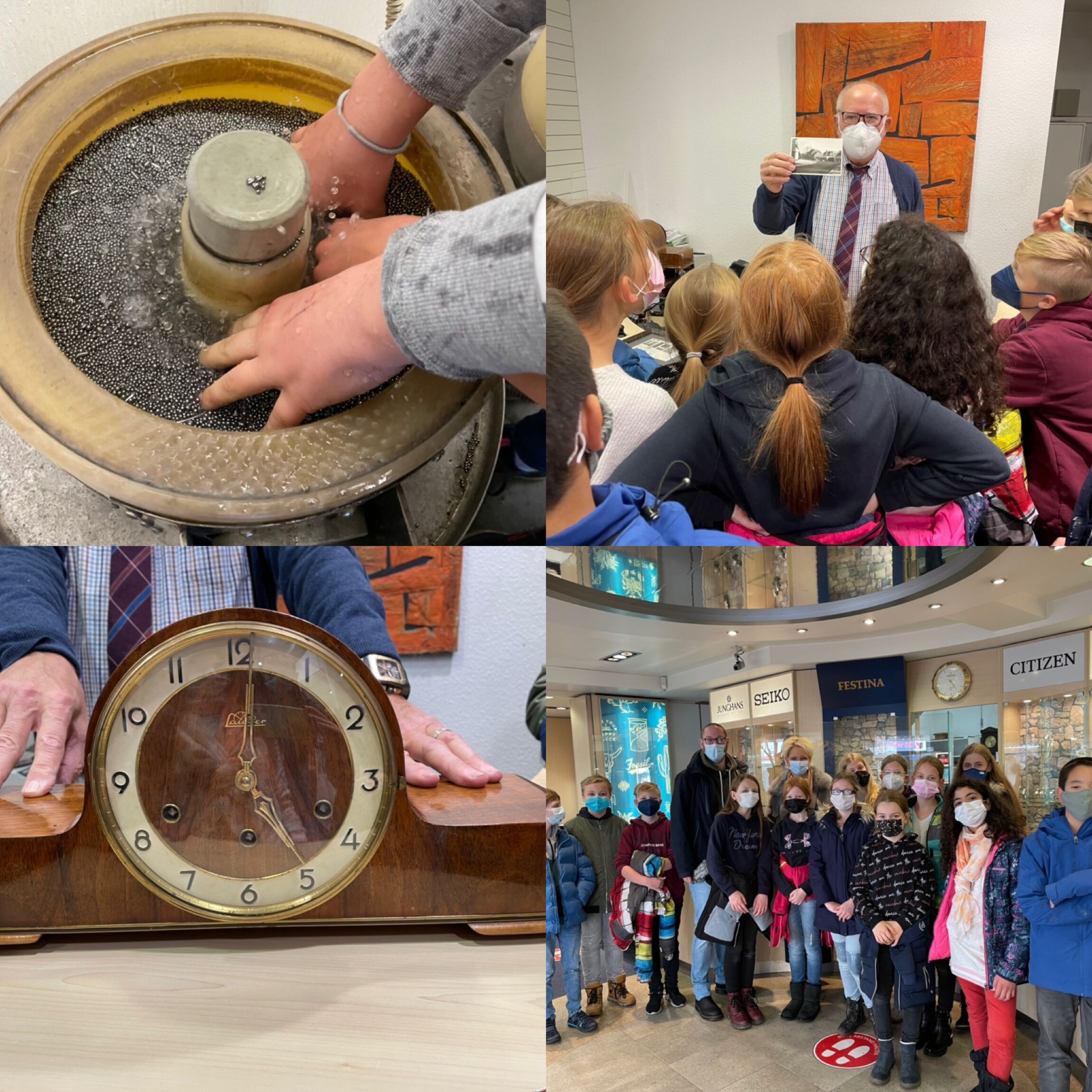 Anfang November haben die Geschichtsdetektive den Juwelier Hungeling in Nordhorn besucht. Das Projekt soll den Schüler:innen aus Jg. 5 und 6 die Geschichte unserer Stadt näherbringen. Dazu gehören natürlich auch unsere ortsansässigen Unternehmen mit langer Tradition und Firmengeschichte. Herr Hungeling hat uns persönlich die Geschichte seines Unternehmens erzählt und zum Beispiel die Funktion einer sogenannten Buffetuhr aus den 60ern erklärt sowie die Geschichtsdetektive ausprobieren lassen, ob sie eine Uhrmacherlupe korrekt verwenden können. Ein weiteres Highlight war das Gefühl, die eigenen Hände in eine Poliertrommel stecken zu dürfen. Zum Abschluss bekamen alle sogar noch ein kleines Souvenir überreicht. Wir bedanken uns sehr bei Herrn Hungeling und seinem engagierten Team für die Führung und den lehrreichen Nachmittag, der bestimmt noch lange in Erinnerung bleiben wird!
