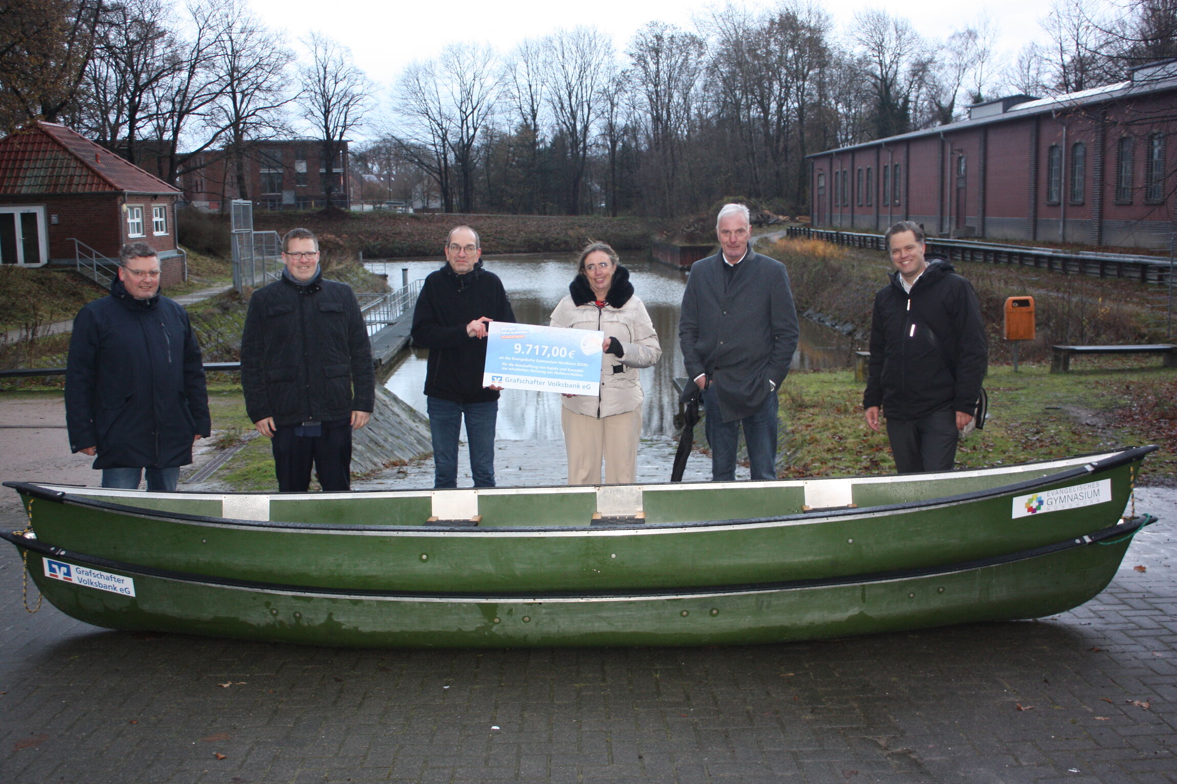 In der vergangenen Woch kamen Vertreter der Volksbank, der Stadt sowie des EGN zusammen, um der Schule einen Scheck in Höhe von 9717 Euro zu überreichen. Mit diesem Betrag wurde der erste Schritt zur Wiederbelebung des Kukkerthafens getätigt, indem acht Kandier, drei Kajaks und die dazugehörigen Paddel und Schwimmwesten angeschafft wurden. Diese lagern bereits in einem der kleinen Häuser am Klukkerthafen und sollen bald von den Schülern genutzt werden.
