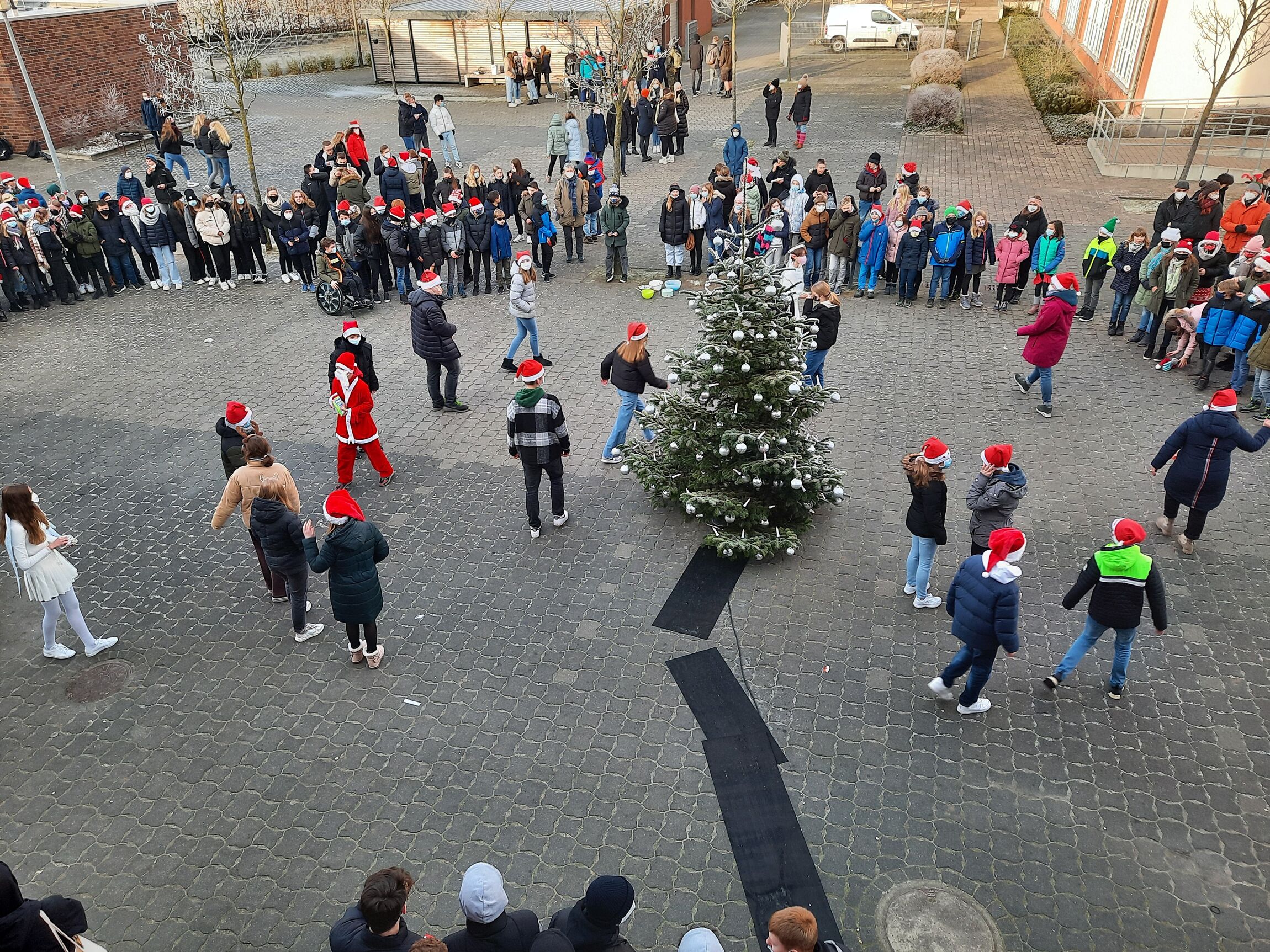 Auch in diesem Jahr fand der traditionelle Baumumgang des EGN statt, wenngleich die Bedingungen natürlich anders waren. Nach einem Hybrid-Gottesdienst, der unter der Leitung von Hilke de Vries organisiert wurden, versammelten sich alle Schülerinnen und Schüler jahrgangsweise auf dem Schulhof, um draußen gemeinsam den Baumumgang zu feiern. Dabei wurden teils Klassenweise, teils aber auch vom ganzen Jahrgang verschiedene Weihnachtslieder präsentiert. Da mit den Masken das Singen natürlich kaum möglich war, standen in diesem Jahr die Präsentation der Stücke oftmals im Mittelpunkt der Darbietungen, so dass sich kreative Tänze und Verkeidungen überlegt wurden. Zum Schluss wurden dann auch die Lehrkräfte gemeinsam mit ehemaligen Schülern des Gymnasiums aktiv und alle performten gemeinsam ihren Song.
