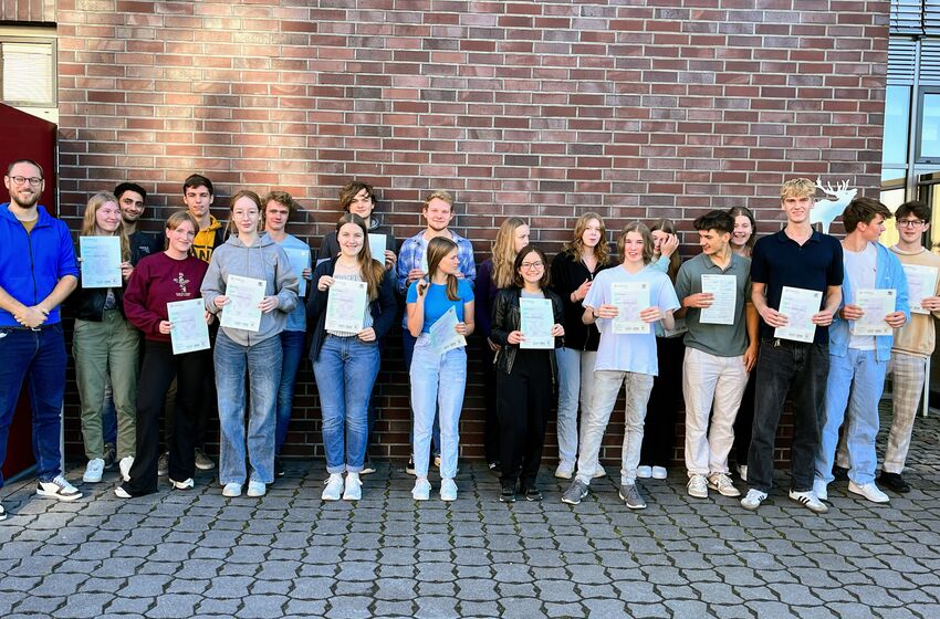 Insgesamt 22 Prüflingen konnte Kursleiter Marvin Weigel als Nachweis einer hohen Sprachqualifikation in Englisch das begehrte Cambridge-Zertifikat (CAE C1) aushändigen. Zwei davon, Marc Bouwer und ...