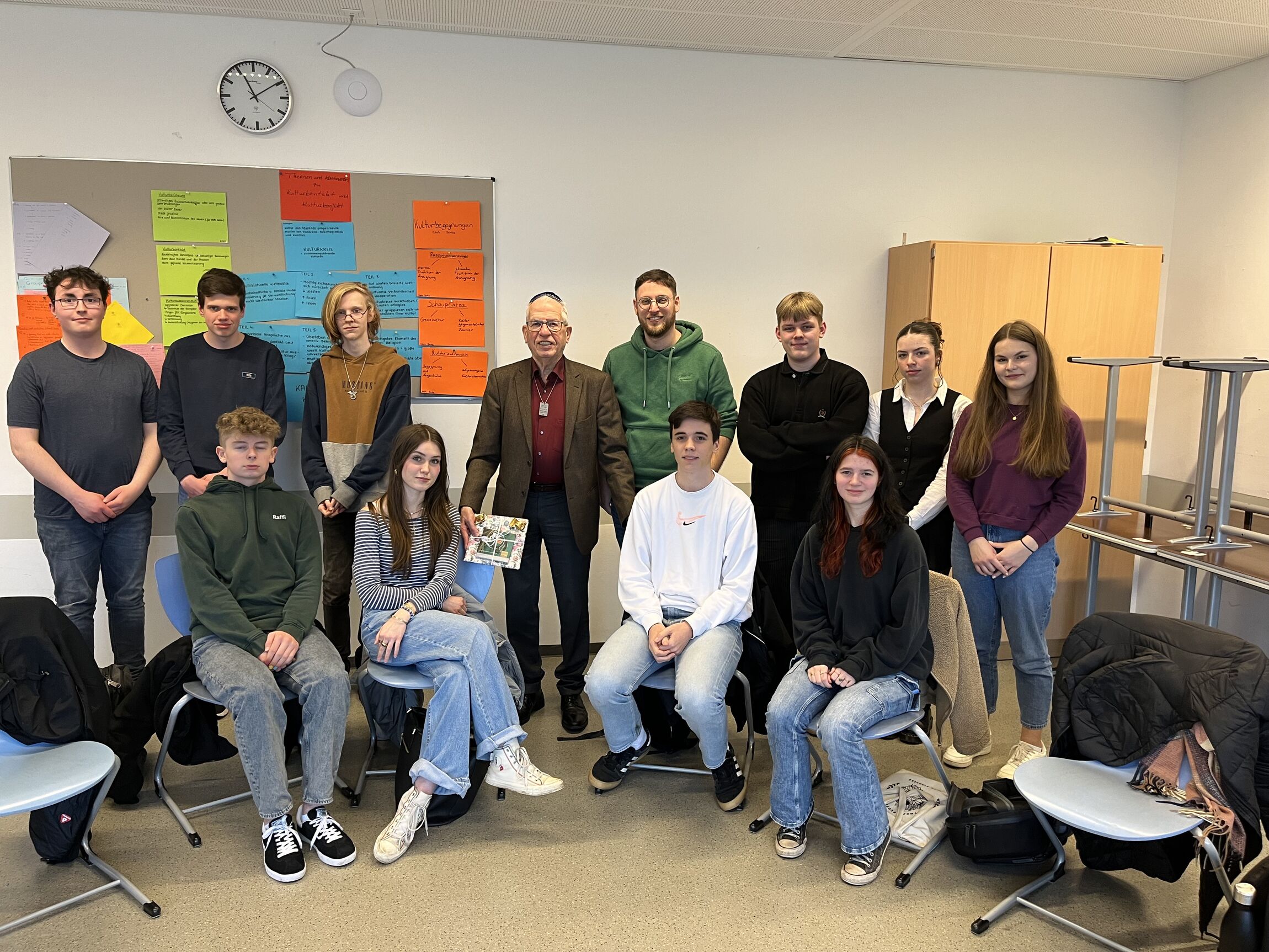 Als einen so kenntnisreichen, offenen und lebendig erzählenden Menschen durften wir ihn heute Morgen erleben: von der Bedeutung der Studentenbewegung für ihn als jüdischen Studenten und seiner Begegnung mit Rudi Dutschke, über die Frage nach der Möglichkeit von Gott nach der Shoah zu sprechen, bis hin zur Rolle der queeren Bewegung in Israel und schließlich der Situation nach dem 7. Oktober in Israel und Deutschland, reichten die Themen unseres Gesprächs. Trotz - oder vielleicht gerade wegen - seiner ganz klaren Haltung appellierte er an die grundsätzliche Dialogbereitschaft. Den anderen in seiner Unterschiedlichkeit wahr- und ernst zu nehmen, darauf komme es an. Darum sei ihm, für den die Stärke Israels (auch die militärische Stärke) selbstverständlich sei, der Dialog mit Palästinensern so wichtig. „Sei ein Mensch!“ darauf komme es an und diese Frage nach der Menschlichkeit sei nach dem 7. Oktober einmal mehr zu stellen. Wir hätten noch Stunden weiter sprechen können, weil das Gespräch so lebendig war und die Fragen kein Ende nahmen. Wir danken für diesen erfahrungsgesättigten Einblick in Geschichte, Politik und Religion. Es war uns eine Ehre Gabor Lengyel bei uns an der Schule zu haben.
