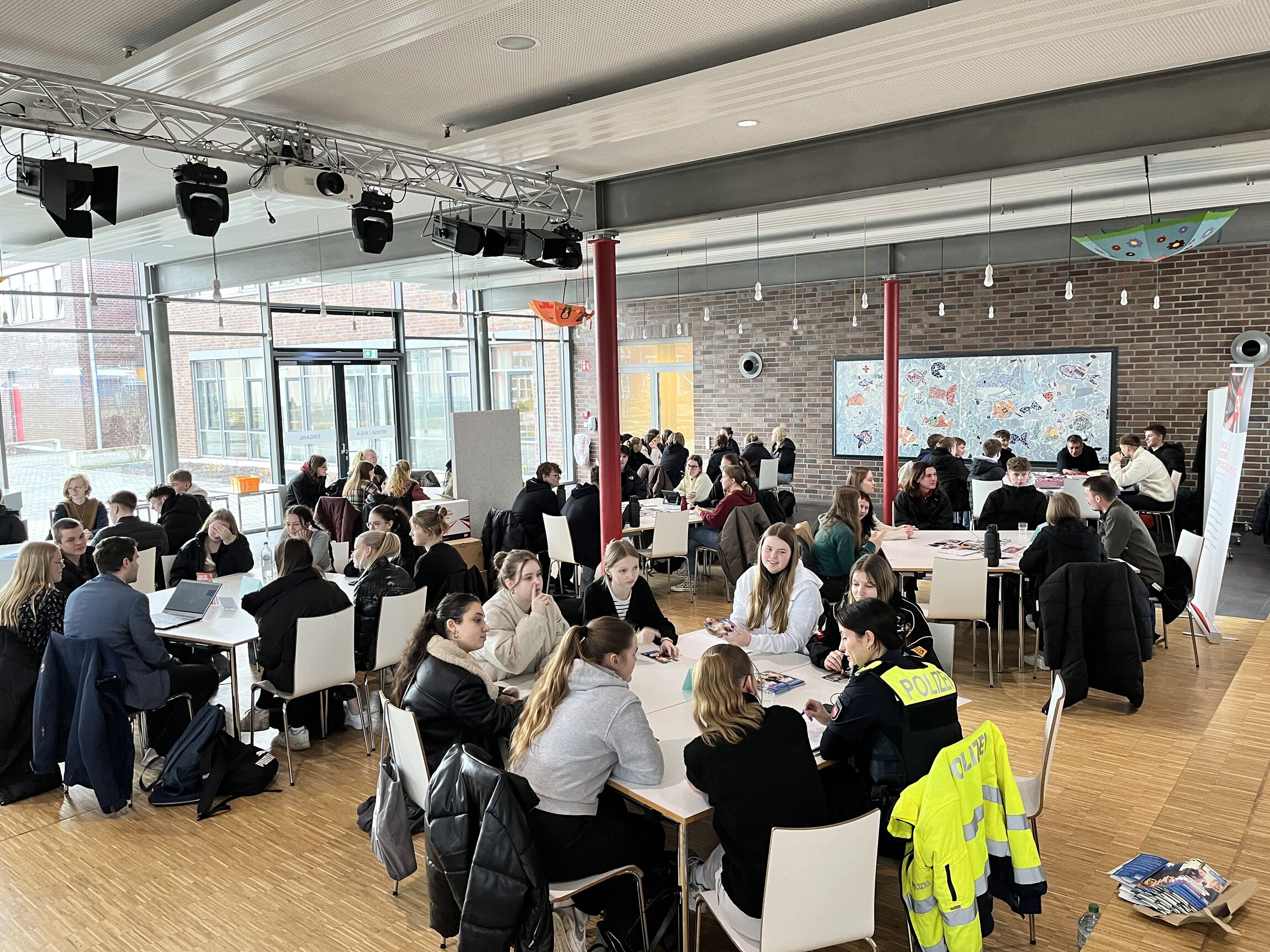 Das Expertenforum Beruf ist mittlerweile seit Jahren ein wichtiges Element der Berufs- und Studienorientierung am EGN. Das Konzept sieht vor, dass sowohl langjährige Kooperationspartner unserer Schule als auch Eltern ihre Berufe dem Jahrgang 11 vorstellen. Dies geschieht in Form eines "Speed-Datings", 12 Gruppentische können für ca. 20 Minuten aufgesucht werden, bevor ein Gong ertönt und der Tisch zu einem anderen Berufsfeld gewechselt wird. Auf diese Weise können zahlreiche neue Eindrücke vermittelt werden, die sonst so nicht möglich wären. Das persönliche und direkte Gespräch ermöglicht einen intensiven Einblick und erste Kontakte für potenzielle Praktika in den Schulferien. Die verschiedenen Bereiche Ausbildung, Hochschule und Universität sind dabei ebenfalls vertreten. Unsere Schüler:innen konnten sich über Informatik, Journalismus, Polizei, Theologie, Sportmanagement, Steuerberatung, Medizin, Veterinärmedizin, Zahnmedizin, Verwaltung, Finanzen und Lehramt informieren. Ein reichhaltiges Angebot, für das wir allen Beteiligten sehr dankbar sind.