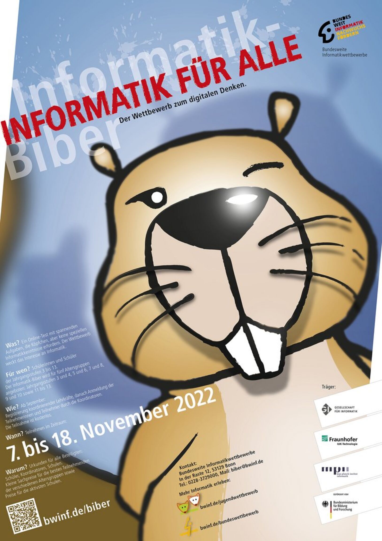 Auch im Jahr 2022 nahm das EGN mit Schüler*innen am bundesweiten Informatik Biber Wettbewerb teil. Der Wettbewerb wurde vom Jahrgang 5 bis zum Jahrgang 13 angeboten. Unsere jüngsten Schüler*innen des Jahrgang 5 haben im Rahmen des Faches "Informatik Computer-Kompetenz" (ICK) am Wettbewerb teilgenommen. Gestaffelt nach Alter wurden online am Computer Aufgaben zum Knobeln und Tüfteln mit informatischem Hintergrund bearbeitet.