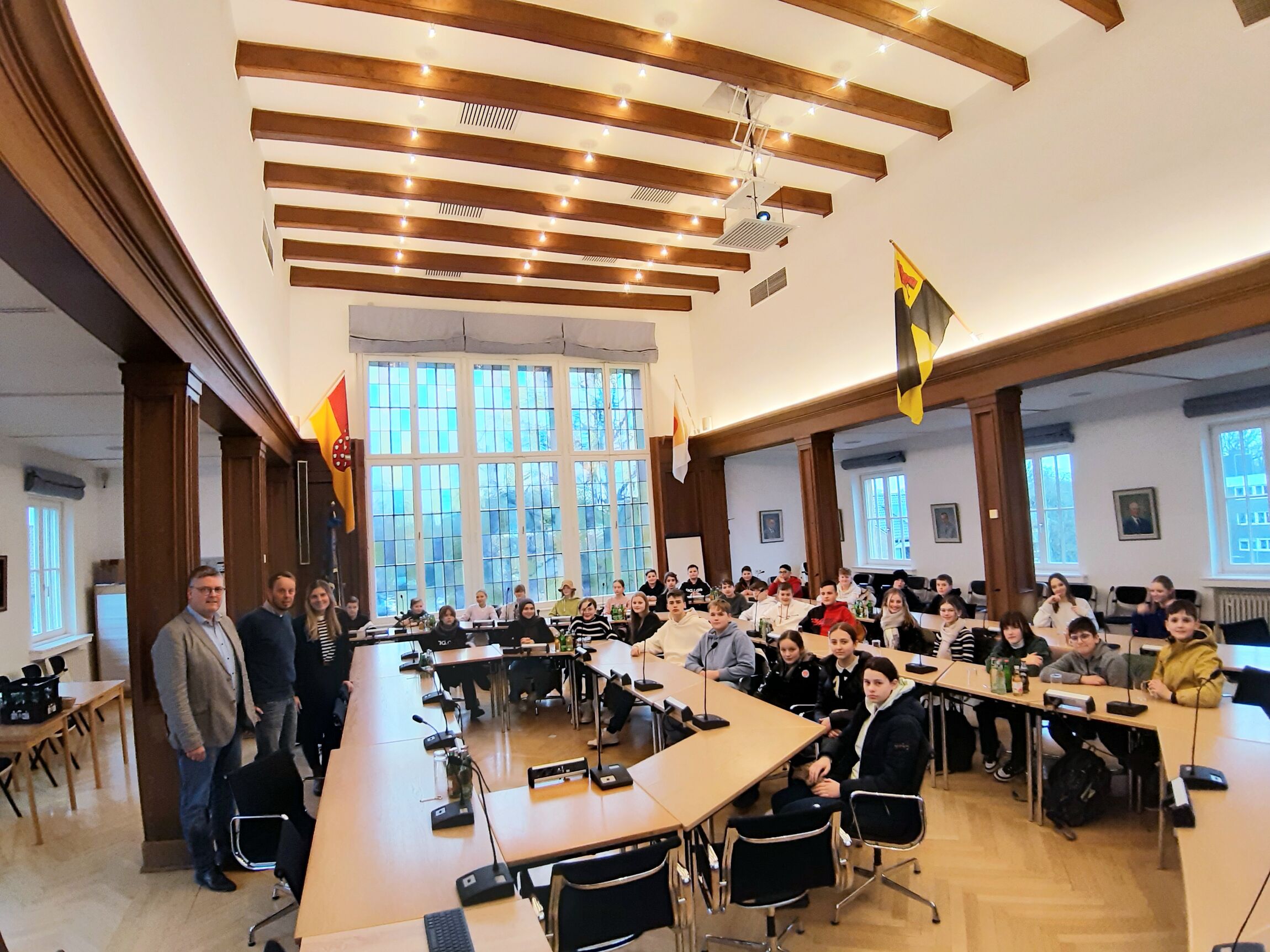 Wie viel muss ein Bürgermeister arbeiten? Was würden Sie machen, wenn Sie nicht Bürgermeister wären? Wie viel verdient ein Bürgermeister? Diese und weitere Fragen stellten Schüler des Jahrganges 8 beim traditionellen Besuch im Rathaus im Rahmen des Politikunterrichtes. Verwaltungschef Thomas Berling nahm sich sehr viel Zeit für den Besuch des EGN und informierte die Gäste über anstehende Aufgaben und Projekte der Stadt Nordhorn.