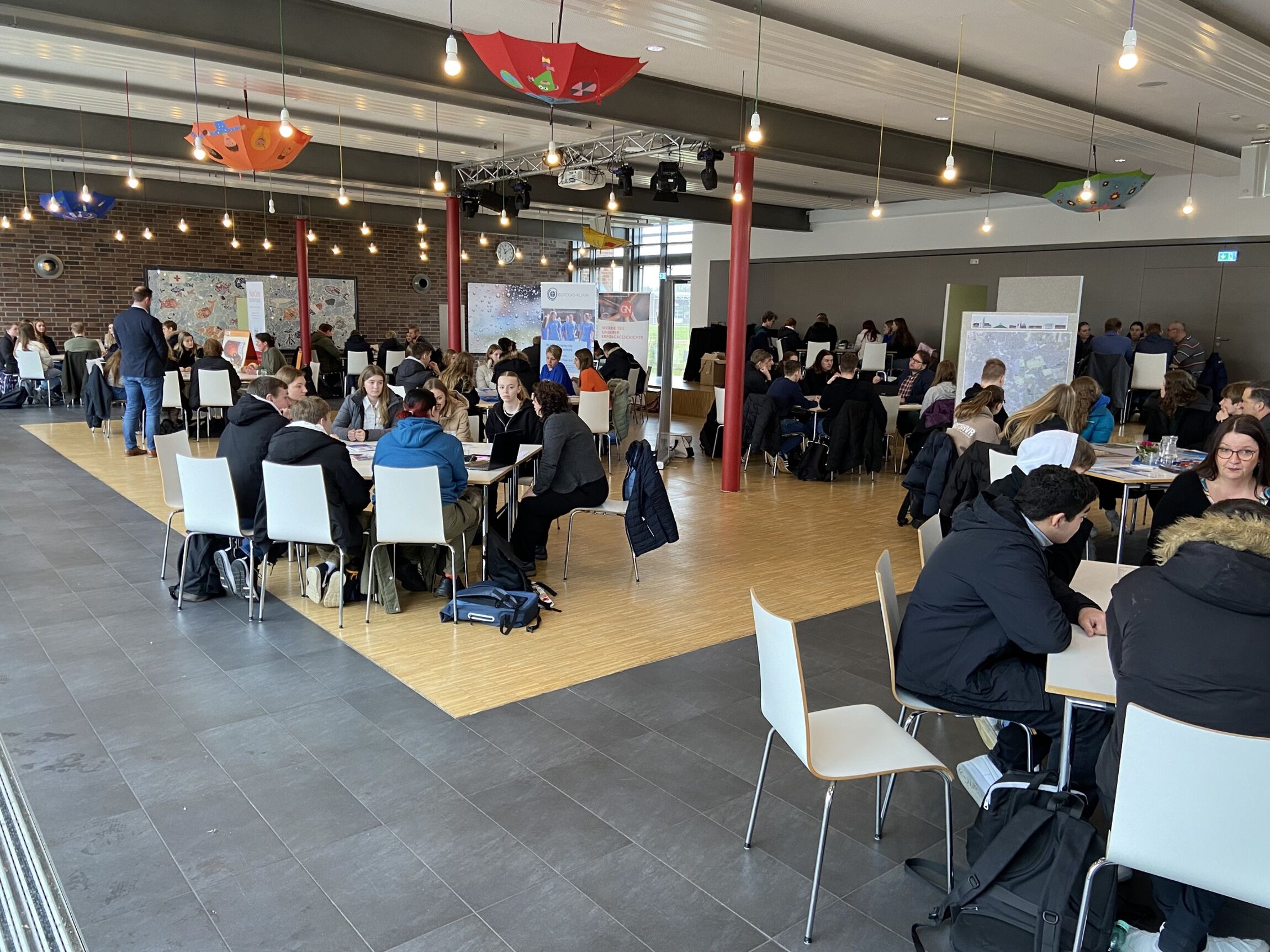 Infobroschüren, medizinische Instrumente und große Karten mit dem Grundriss der Stadt Nordhorn - die Mensa des Evangelischen Gymnasiums Nordhorn sah an diesem Freitag deutlich anders aus, als an anderen Tagen. Experten aus verschiedenen Berufen kamen an diesem Tag zusammen und erörterten viele, für Jugendliche wichtige Fragen zum Berufsleben: Wie viele Stunden müssen Berufstätige am Tag arbeiten? Welche Stärken und Schwächen braucht man in verschiedenen Ausbildungen? Wie verträgt sich Arbeits- und Privatleben miteinander? Die Antworten darauf und in kurzer Zeit möglichst viele Informationen über den Traumberuf zu erfahren, das waren die Ziele, die sich das Evangelische Gymnasium Nordhorn auch in diesem Jahr beim Expertenforum Beruf gesetzt hat.