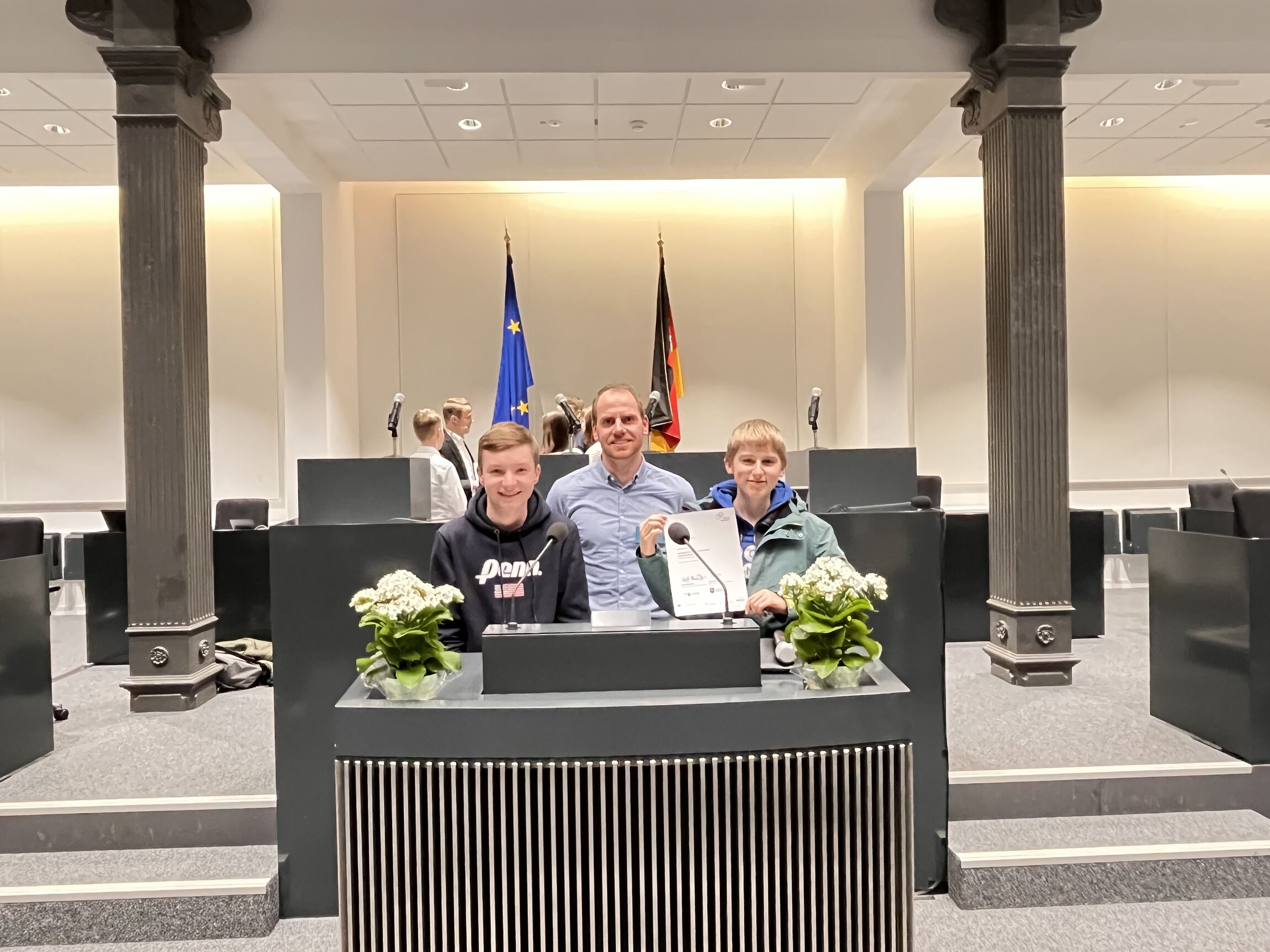 Unterstützt wurde Martin am Dienstag von Luce Worzischek, welcher als Nachrücker der Altersklasse II und eventueller Jurorenersatz für die Altersklasse I eingeladen wurde. Dadurch, dass Luce keine der Aufgaben bekleiden musste, war er für Martin während des Tages eine wertvolle mentale Unterstützung. Er konnte außerdem sowohl Martin als auch Herrn Hardt durch seine Ortskenntnis bei der ein oder anderen Raumsuche helfen, da er vor kurzem ein einwöchiges Praktikum im Landtag absolvierte und sich in den Räumlichkeiten bestens auskannte. Um 20:30 Uhr endete der spannende und ereignisreiche Tag und resümierend stellten sowohl Martin als auch Luce fest, dass dieser für sie eine wertvolle Erfahrung war und sie planen, im nächsten Jahr wieder an dem Wettbewerb teilzunehmen, wenn sich die Möglichkeit bietet.