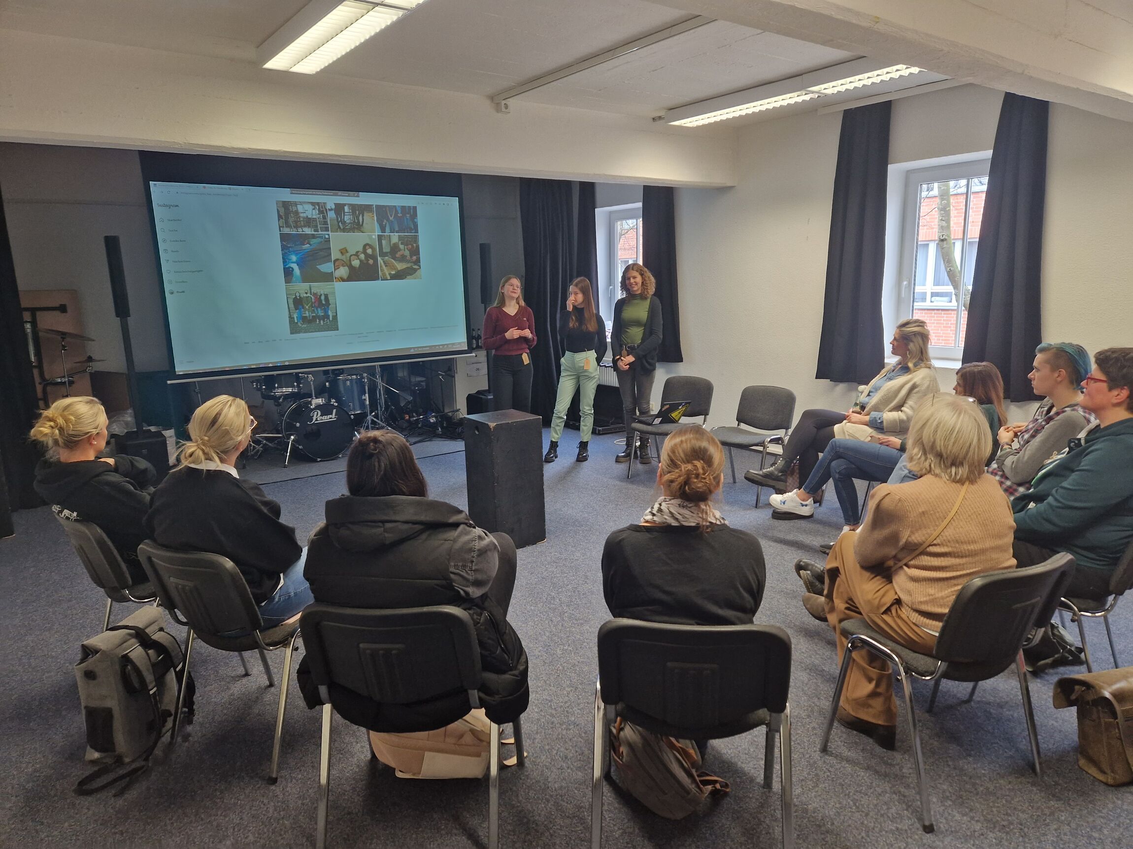 Am 16. März machte sich eine kleine Delegation des EGN unter Leitung von Herrn Großmann auf den Weg in die Alte Weberei, um im Rahmen von "Frei Day" sowie "Bildung für nachhaltige Entwicklung" (BNE) auf der Veranstaltung "Neue Strukturen wagen" das Projekt Herausforderung einer Öffentlichkeit zu präsentieren. Da, wie der Zufall es so wollte, die Herausforderungswoche im Jahrgang 10 parallel stattfand, war es möglich, den interessierten ZuhörerInnen und Zuhörern über Live-Schaltungen Eindrücke und Erfahrungen der Schülerinnen und Schüler in Echtzeit zu vermitteln. So berichteten Gruppen über die Arbeit an einem Kindergarten in Dänemark, über ihre Auftritte als Straßenmusikerinnen in der Münsteraner Innenstadt, über ihre Mitarbeit im Jugendinternat des Fußball-Bundesligisten VfL Bochum oder über ihr sozial-diakonisches Engagement in der ungarischen Hauptstadt Budapest. Im Anschluss ließen die Schülerinnen Aileen Boerman, Lina Umbreit und Lina Hüsemann die Gäste an ihrer 2021 bewältigten Herausforderung teilhaben. Souverän und eingespielt berichteten die drei Mädchen von der Anfertigung, Verschiffung und Bereitstellung ihres müllfressenden Fisches "Goby" auf der Nordseeinsel Norderney. Bildlich unterstützt und lebhaft vorgetragen, berichteten sie den TeilnehmerInnen und Teilnehmern des Workshops von Widrigkeiten sowie Begleitumständen der Corona-Pandemie, die das angestrebte Projekt zusätzlich herausfordernd machten. Die Resonanz auf die Präsentation sowie das Thema Herausforderung allgemein war durchweg positiv und das große Interesse in Form von Nachfragen konnte im angesetzten Zeitrahmen kaum gestillt werden. Zum Abschluss der Veranstaltung wurde noch einmal unterstrichen, dass es Mut benötigt, um neue Strukturen zu wagen. Dem EGN dürfte man somit guten Gewissens das Gütesiegel "couragiert" verleihen ...