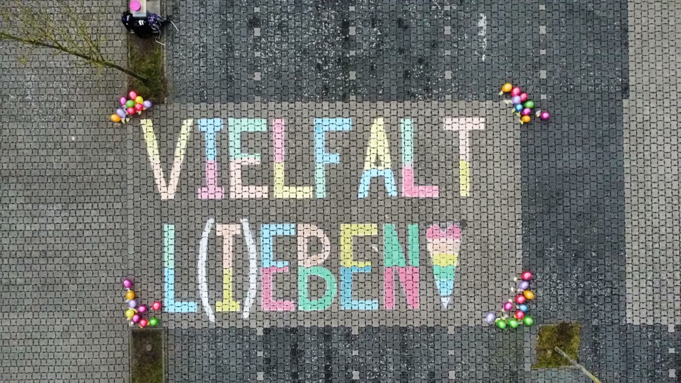 Im Rahmen der Internationalen Wochen gegen Rassismus hat unsere AG „Schule ohne Rassismus – Schule mit Courage“ mit einigen weiteren freiwilligen kreativen Schüler*innen aus der Oberstufe unseren Schulhof mit dem Statement „Vielfalt l(i)eben!“ und vielen bunten Luftballons verschönert. Das Ganze wurde mit einer Drohne aufgenommen und in einem gemeinsamen Film von verschiedenen SoR-SmC-Schulen verarbeitet. Auch Joshua van Greuningen, unser Schülersprecher, und Frau Dr. Obst kommen in diesem Film zu Wort. Unseren Beitrag findet ihr ab der Minute 4:20 über folgenden Link: Film