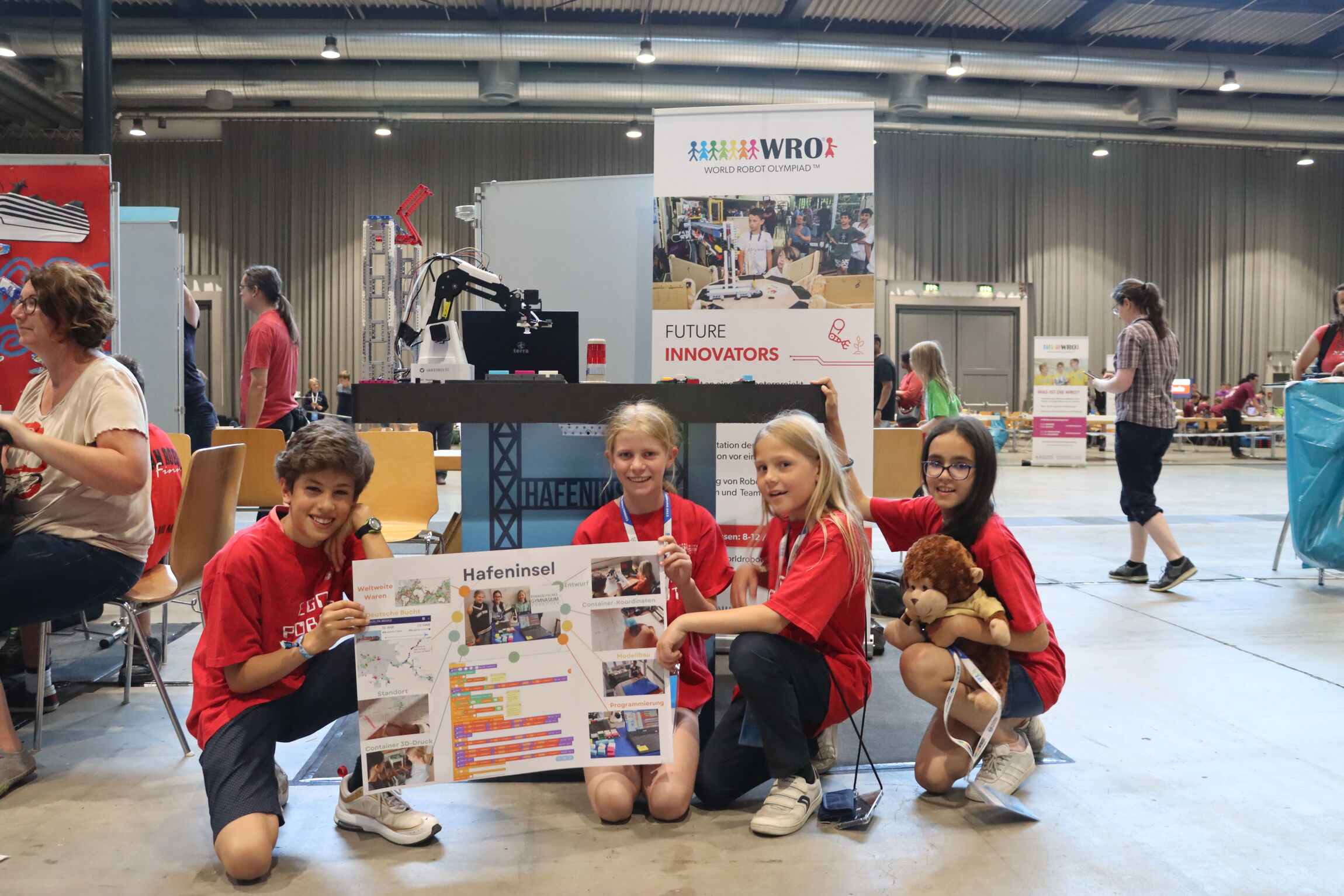 In der schönen Stadt Freiburg fand in den Messehallen am 16./17. Juni das Deutschlandfinale der World Robotik Olympiad (WRO) statt. Das Team um Julius Kirchmann (5b), Mina Chakravarthy (5a), Mia Lübbers (5a) und Valentin Pierau (5a) qualifizierte sich in der Kategorie "Future Innovaters" mit der "Hafeninsel". Insgesamt traten in 6 Kategorien 122 Teams gegeneinander an. Die Hafeninsel konnte einen respektablen 10. Platz ergattern. Dies reichte zwar nicht für die Weiterleitung in das Weltfinale in Panama, jedoch konnte das Team sehr wertvolle Erfahrungen sammeln. Viel Aufmerksamkeit bekam das Team durch ZDF Logo. Das Fernsehteam begleitete den Wettbewerb und senedete am 19.06.2023 eine sehenswerten Bericht von der WRO und unserm Team (LINK ab ca Minute 9).