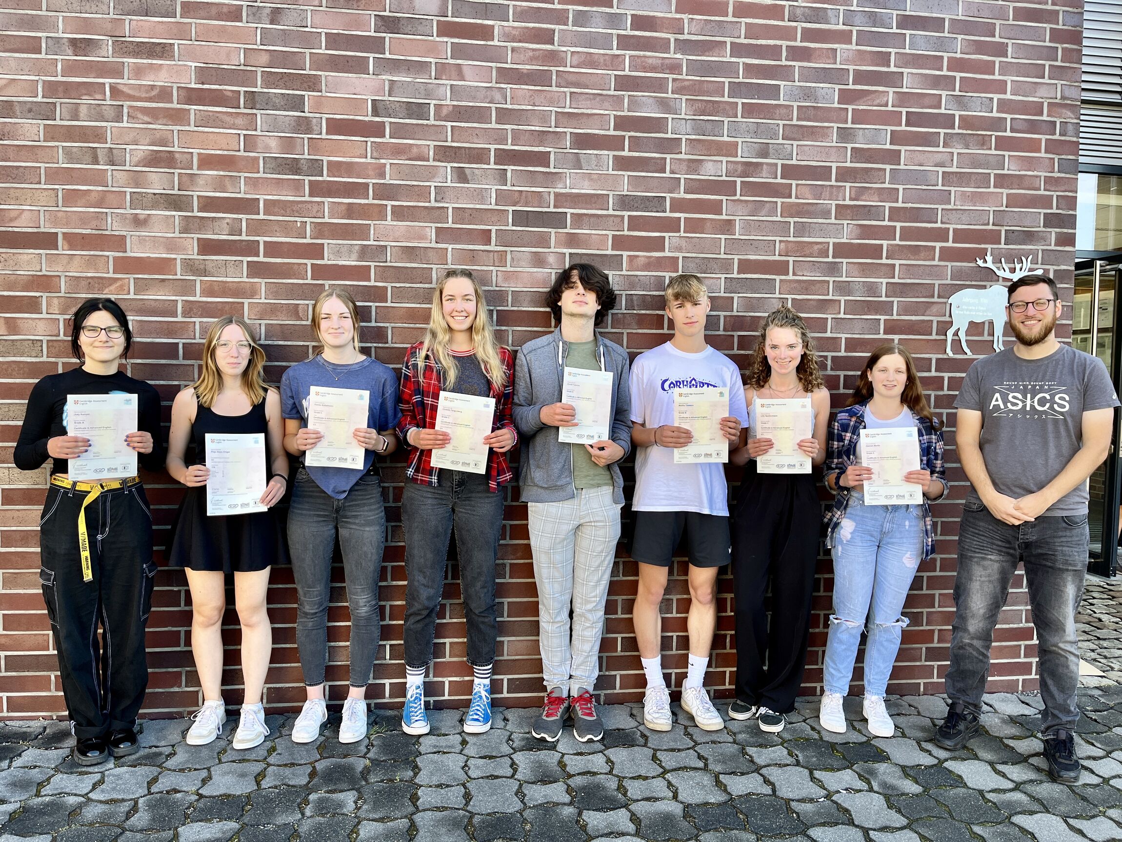 Josy Kemper, Finja Krüger, Femke Büttelmann, Christin Tangenberg, David Praevcke, Mathis Timmers, Lily Spiekermann und Hannah Martin (v.l.n.r. im Bild) haben nach mehreren Monaten Vorbereitung und Arbeit nun endlich ihr CAE-Zertifikat erhalten. Die mehrstündige Prüfung war auf das C1-Niveau ausgerichtet. Das CAE-Zertifikat findet weltweite Anerkennung und erleichtert Studieren sowie Arbeiten im Ausland. "Neben der regulären Unterrichtsverpflichtung noch zusätzlich an einer solch anspruchsvollen Prüfung teilzunehmen, zeigt besonderes Engagement und Leistungsbereitschaft," so Marvin Weigel, unsere CAE-Lehrkraft. Josy Kemper erhielt sogar einen C2-Nachweis, was ungefähr den Sprachfähigkeiten eines Muttersprachlers auf akademischem Niveau entspricht.