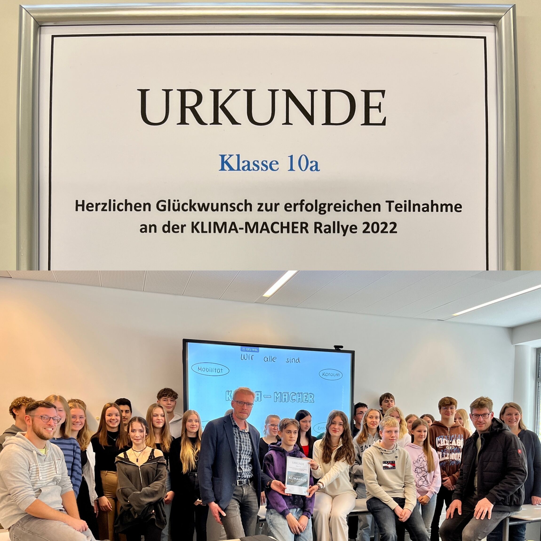 Clara Weitemeier wurde stellvertretend für ihre Klasse, die 10a, als Gewinnerin der KLIMA-MACHER Rallye 2022 ermittelt. Der Jubel war groß, denn als Preis darf die Klasse jetzt auf Kosten des Landkreises und der Stadt Nordhorn auf Exkursion ins Klimahaus nach Bremerhaven aufbrechen. Der Klimawandel ist eine der größten Herausforderungen unseres Jahrhunderts und um diese Herausforderung zu meistern, müssen wir alle gemeinsam aktiv werden. Jede und jeder kann dabei einen Beitrag leisten. Vor diesem Hintergrund hat die Klimaschutz- und Energieagentur Niedersachsen mit Unterstützung des Niedersächsischen Umweltministeriums und RENN.nord die Wanderausstellung „Klima-Macher" entwickelt, die dann zum Beispiel bei uns im EGN ausgestellt wurde. Wir alle können unseren CO2-Fußabdruck verkleinern und eine nachhaltigere Gesellschaft fördern, indem wir bewusster konsumieren und unseren Lebensstil ändern - Die 10a wird dazu noch viele weitere Eindrücke im Klimahaus Bremerhaven erfahren dürfen.
