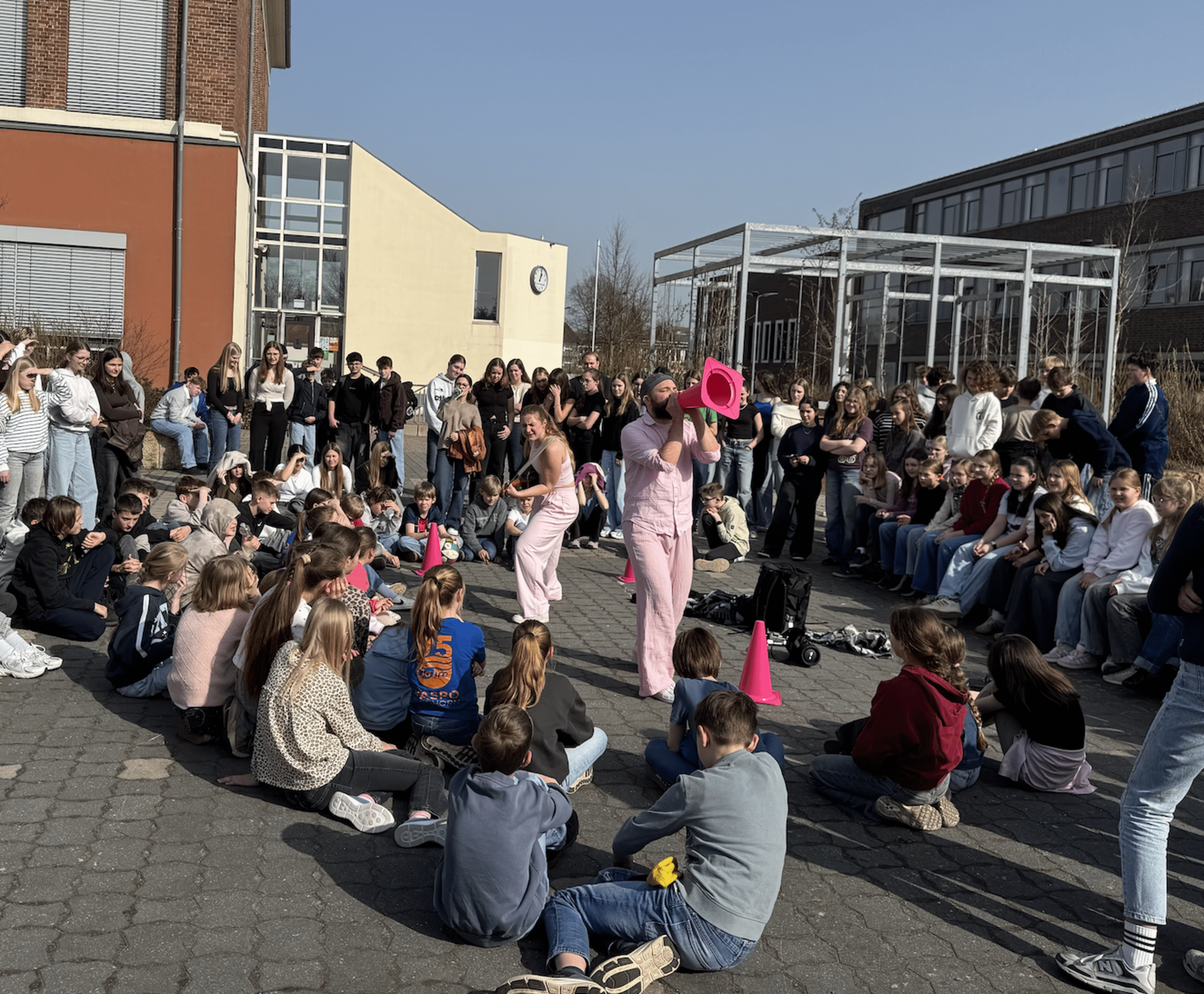 Viele interessierte Schülerinnen und Schüler versammelten sich auf dem Schulhof, um diesen besonderen Theaterimpuls zu erleben. Das Ensemble bezog das Publikum immer wieder in seine Überlegungen ein und regte zum Nachdenken und Diskutieren an.