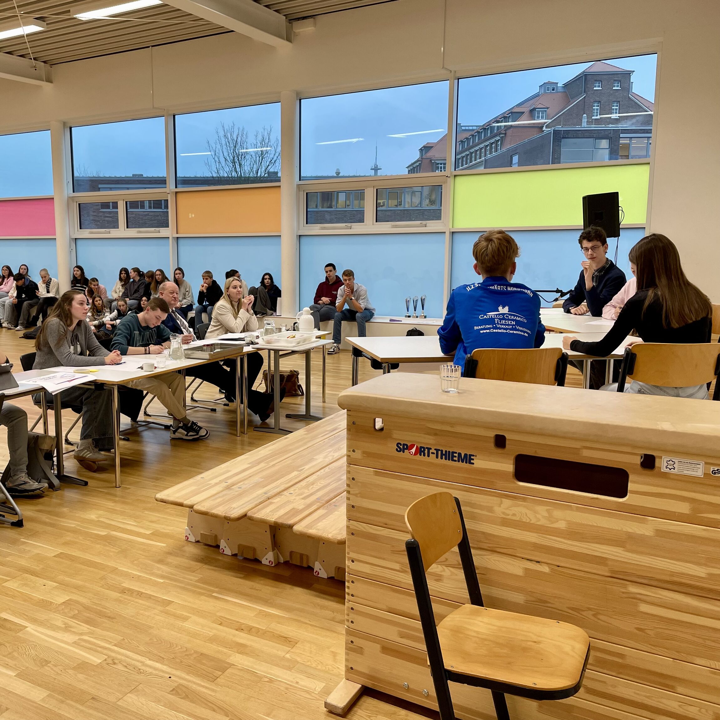 Die Teilnehmerinnen und Teilnehmer zeigten großes Engagement und beeindruckten die Jury mit fundierten Argumenten und rhetorischen Fähigkeiten. Jede Debatte war von einem hohen Maß an Sachlichkeit und Respekt geprägt, was den Wettbewerb zu einem lehrreichen und inspirierenden Erlebnis für alle Debattierenden und die Schüler*innen der Jahrgänge 8 und 9 machte. Wie schon im letzten Jahr fiel auch in diesem Jahr das hohe Niveau der Debattant*innen auf, die sich gründlich auf ihre Streitfragen vorbereitet hatten. Insbesondere das Interesse und das steigende Niveau der Debatten in der Altersklasse I sind als Ergebnis der Unterrichtsreihe zum Debattieren in der Jahrgangsstufe 8 zu sehen, an deren Ende die Sprechprüfung in Form einer Debatte nach dem Vorbild von Jugend debattiert steht. Altersstufe II zeigt, dass viele Debattant*innen Jugend debattiert über mehrere Jahre in unterschiedlichen Funktionen treu bleiben und ihre Debattierfähigkeiten in den Bereichen Sachkenntnis, Gesprächsfähigkeit, Ausdrucksvermögen und Überzeugungskraft von Jahr zu Jahr steigern können.