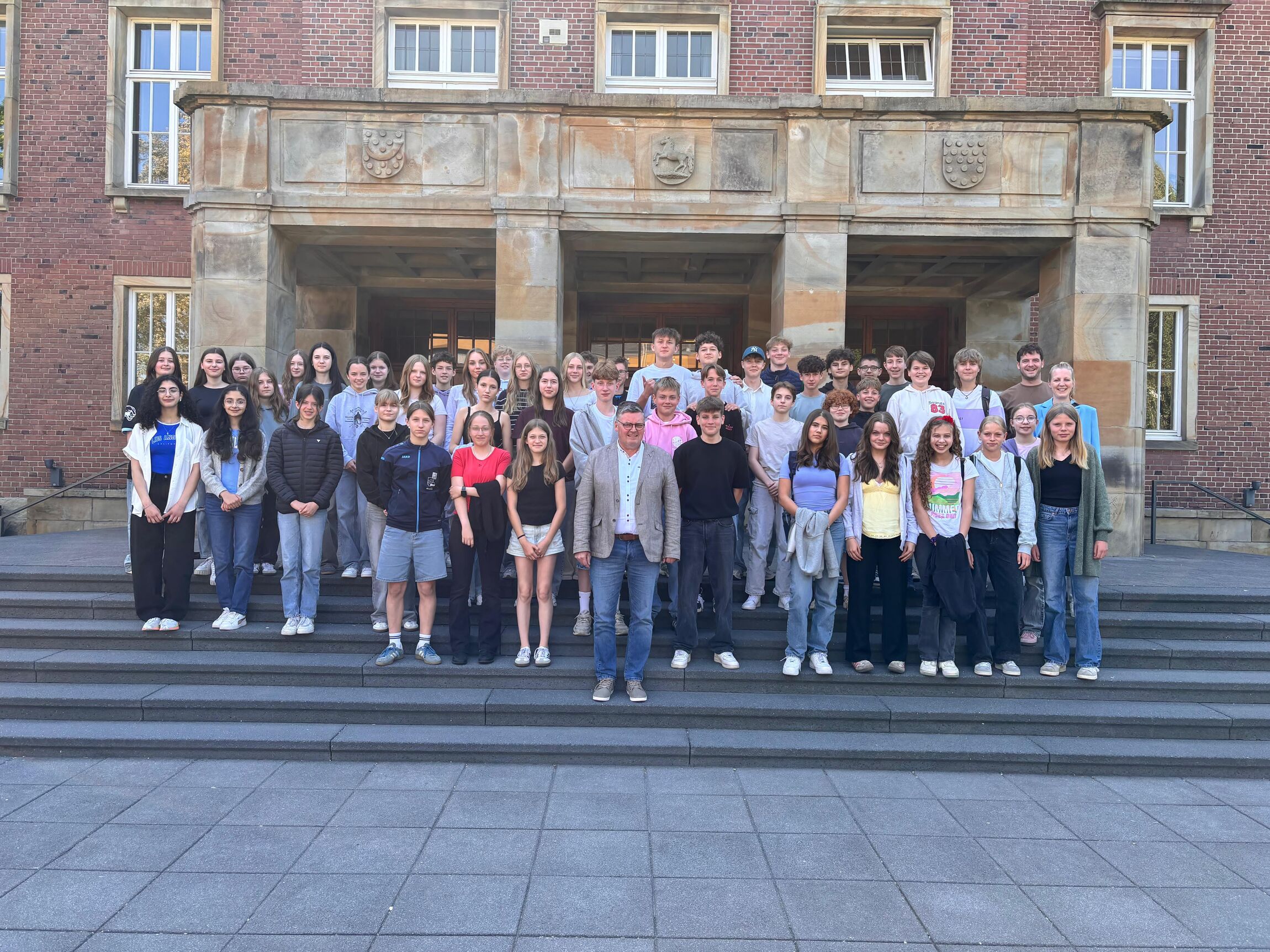 Abgerundet wurde der Besuch durch ein gemeinsames Gruppenfoto vor dem Rathaus. Die Schülerinnen und Schüler zeigten sich im Nachgang beeindruckt davon, wie vielseitig und verantwortungsvoll die Arbeit eines Bürgermeisters ist – und wie viel Gestaltungskraft in der Kommunalpolitik steckt.