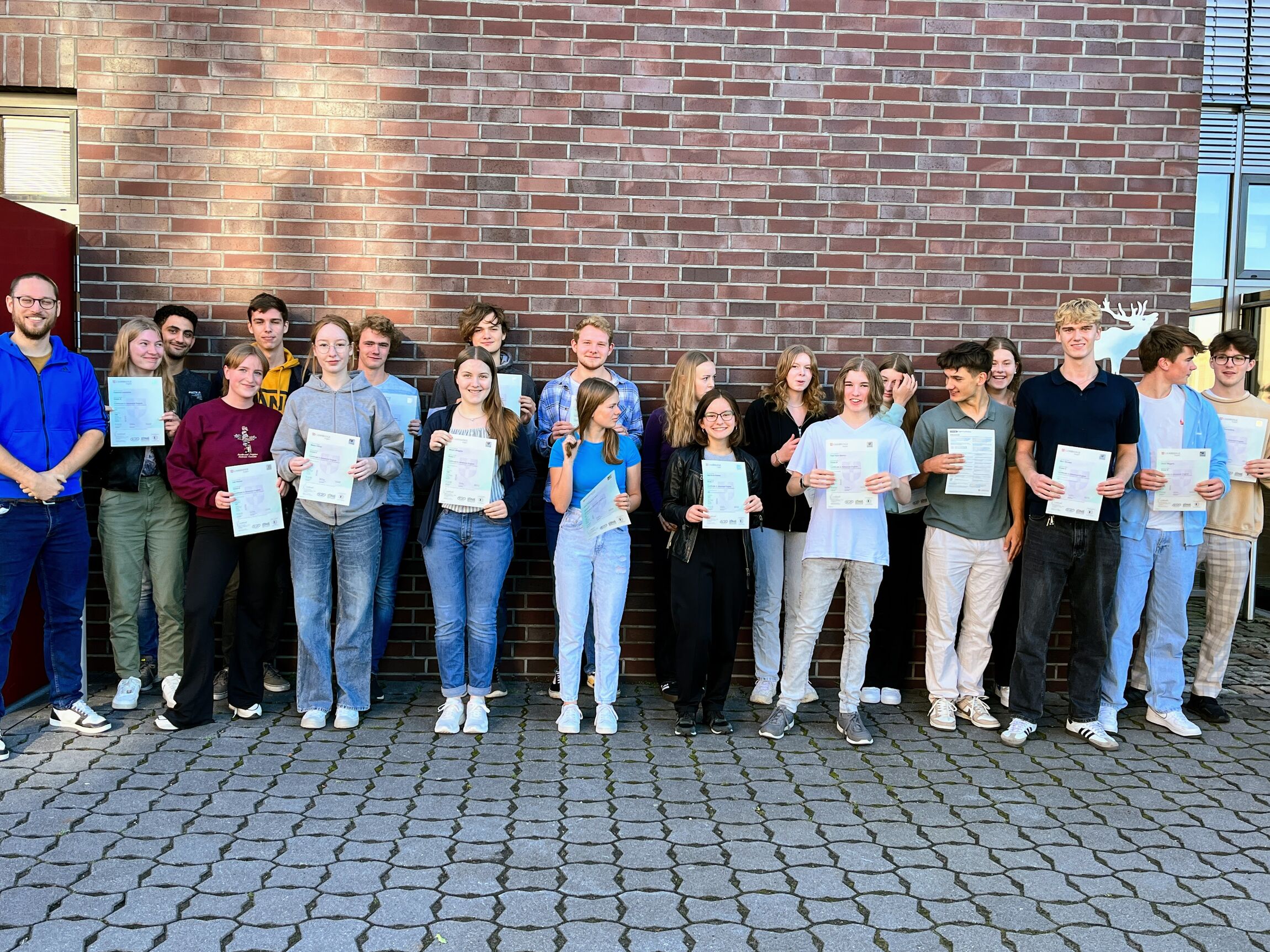 Insgesamt 22 Prüflingen konnte Kursleiter Marvin Weigel als Nachweis einer hohen Sprachqualifikation in Englisch das begehrte Cambridge-Zertifikat (CAE C1) aushändigen. Zwei davon, Marc Bouwer und Lisa-Marie Karvink, erhielten erhielten sogar den C2-Nachweis, was ihnen Fähigkeiten auf Muttersprachler-Niveau bescheinigt. Zur Einordnung: Das C1-Niveau entspricht ungefähr dem Niveau einer Englischlehrkraft, es handelt sich um eine beachtliche Leistung von allen, die teilgenommen haben. Wir gratulieren allen Prüflingsteilnehmer:innen herzlich.