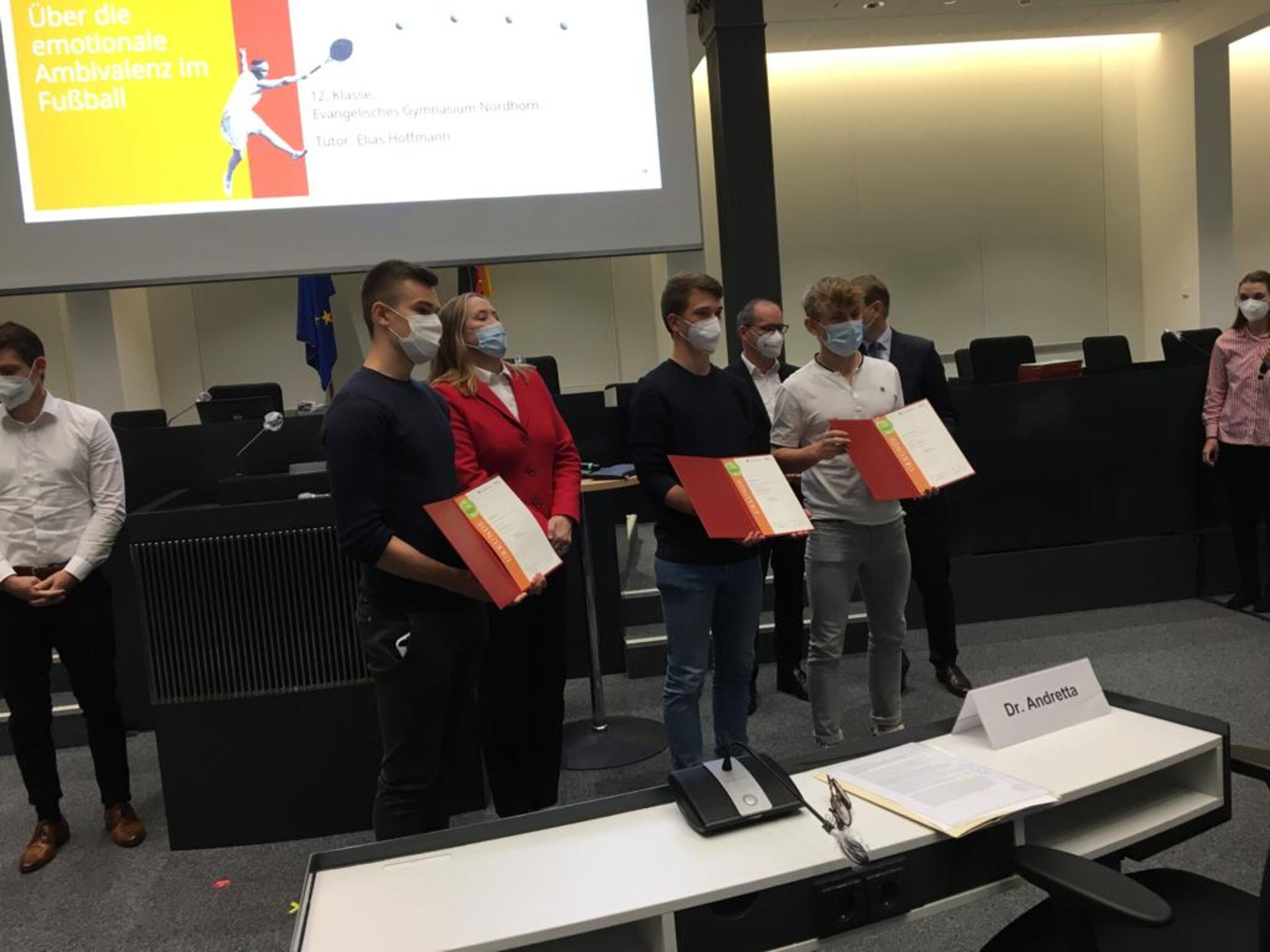 Drei Beiträge hat das Evangelische Gymnasium Nordhorn für den Geschichtswettbewerb des Bundespräsidenten auf Landesebene in Niedersachsen eingereicht. Alle drei Beiträge gewannen einen Landespreis. Aufgrund der Anzahl und Qualität an prämierten Beiträgen gewann die Schule ebenfalls die Auszeichnung "Landesbeste Schule Niedersachsen". Nun fand die feierliche Übergabe der Preise statt. Die prämierten Teilnehmer und deren Tutoren waren am 28.09.21 nach Hannover in das Forum des Niedersächsischen Landtags zur Würdigung eingeladen. Die Präsidentin des Landtags, Dr. Gabriele Andretta und unser Kultusminister Grant Hendrik Tonne waren persönlich anwesend, um die erfolgreichen Schüler auszuzeichnen. Einige bekannte Sportler richteten den Schülern zudem per Video-Botschaft ihre Glückwünsche aus, darunter zum Beispiel Wladimir Klitschko. Diese Gratuatoren waren eingeladen, da in diesem Jahr die besondere Bedeutung des Sport auch in der Geschichte von den Schülerinnen und Schülern thematisiert werden sollte. So beschäftigte sich Emma Schönzart aus dem 6. Jahrgang mit der Frage, inwieweit der Tennissport ein Vorbild für die gesellschaftliche, geschlechtliche Gleichberechtigung ist. Bei den Oberstufenschüler drehte sich hingegen alles um den Fußball: Die Elftklässlerinnen Kaja Geers, Sophia Helming, Hannah Schmidt und Sara Visser thematisierten in ihrer Arbeit mit dem Titel “Zwischen NINO und Portugal - Nordhorner Fußball auf der Spur” die Entwicklung der Volkssportart in der Grafschaft. Die Schüler Moritz Beier, Benno Reichel und Malte Rottstock befassten sich eher mit den Emotionen, die Fußball auslösen kann, und gaben ihrer Arbeit den Titel “Zwischen Ekstase und Eskalation: Über die emotionale Ambivalenz im Fußball”. Alle drei Arbeiten wurden in ihrer jeweiligen Altersgruppe mit dem Hauptpreis als Landessieger ausgezeichnet und erreichten somit einen tollen Erfolg. Der Wettbewerb steht unter der Schirmherrschaft des Bundespräsidenten Frank-Walter Steinmeier und wird von der Körber-Stiftung alle zwei Jahre ausgerichtet. Die Schüler Niedersachsens werde immer wieder aufs Neue eingeladen und herausgefordert, sich mit gesellschaftlich relevanten Themen in Bezug zu Geschichte auseinanderzusetzen.