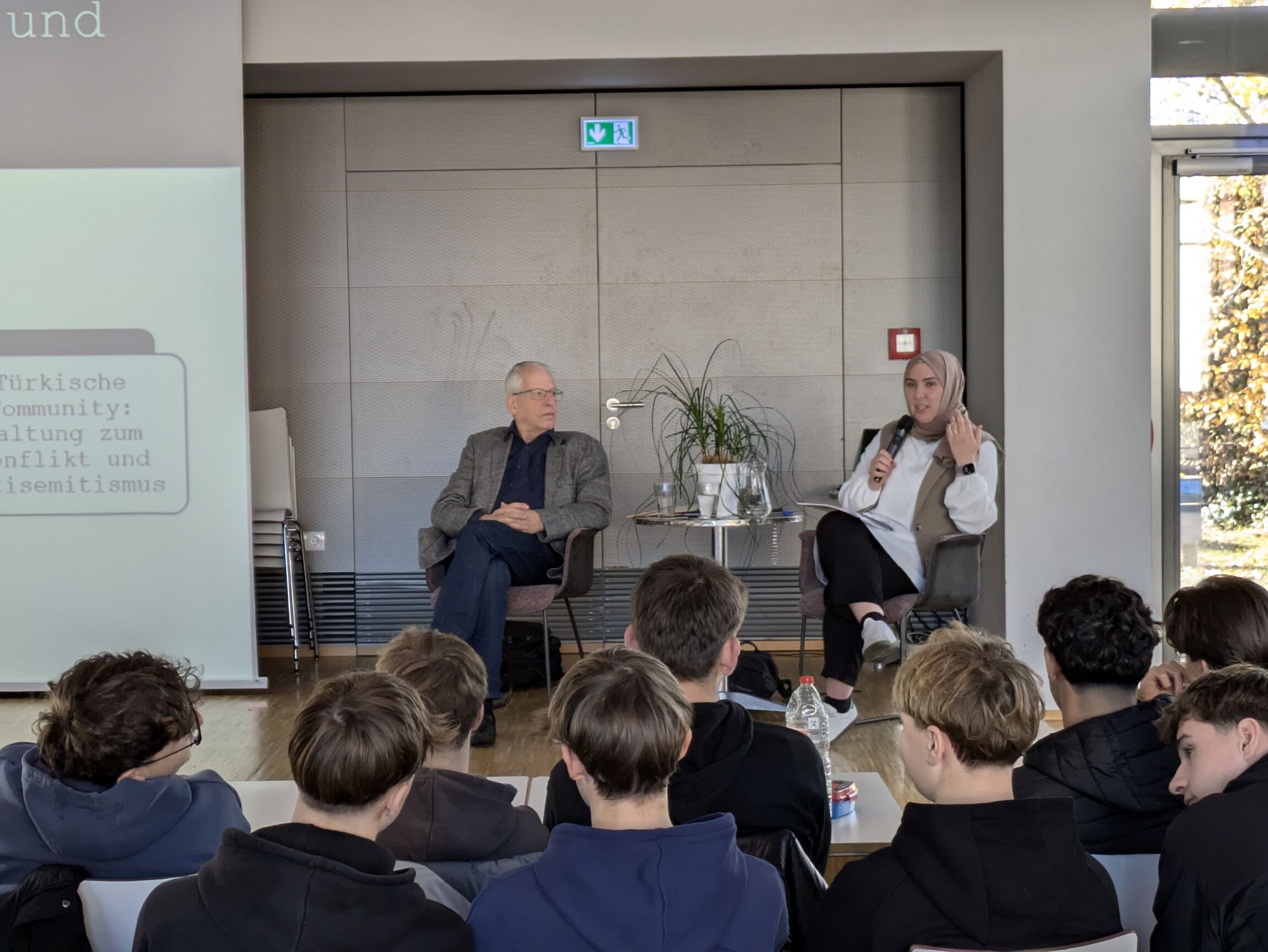 Rumeysa und Gabor stellten ihren persönlichen Werdegang vor, der Eindruck bei unseren Schüler:innen hinterließ und zeigte, wie wichtig eigene Entwicklung, Veränderung und Engagement sind. Anschließend referierten beide zu Israel/Palästina und es gab einen Einblick davon, wie die türkische Community zum Nahostkonflikt und Antisemitismus steht. Wobei schnell deutlich wurde, wie unterschiedlich und vielfältig die Perspektiven sind und es nicht die eine Haltung dazu gibt.