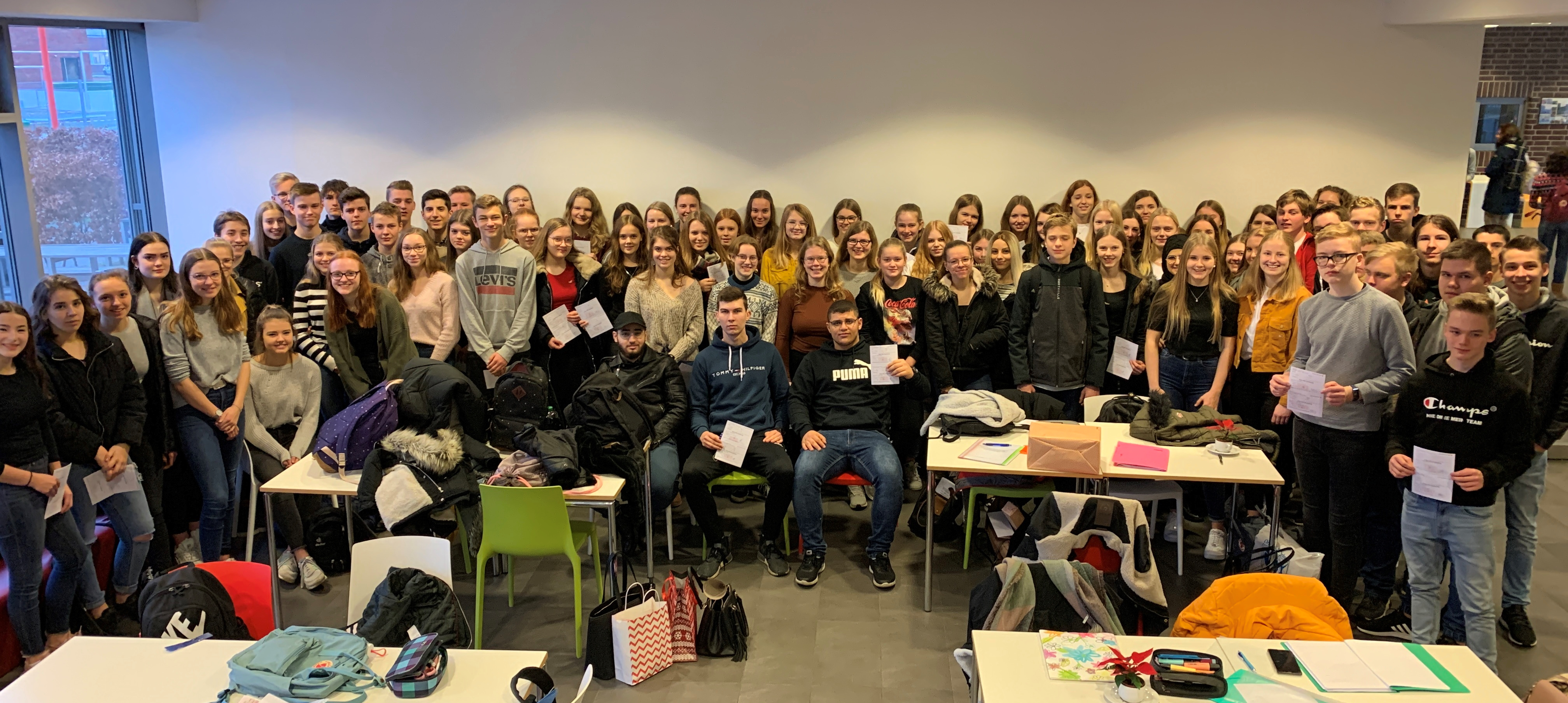 Auch in diesem Jahr hat unsere gesamte Jahrgangsstufe 10, aufgeteilt in fünf Gruppen, im Zuge der Vorbereitung auf die praktische Umsetzung der „Herausforderung“ (23.03.-27.03.2020) an einem Erste-Hilfe-Kurs teilgenommen. Möglich machte dies unser Kooperationspartner im Ganztag, das Deutsche Rote Kreuz, welches am 11.11. und 18.11.2019 mit je zwei bzw. drei ÜbungsleiterInnen die insgesamt 86 Schülerinnen und Schüler hier bei uns am EGN ausgebildet hat. An dieser Stelle möchten wir den ÜbungsleiterInnen des DRK für dieses Engagement herzlich danken!