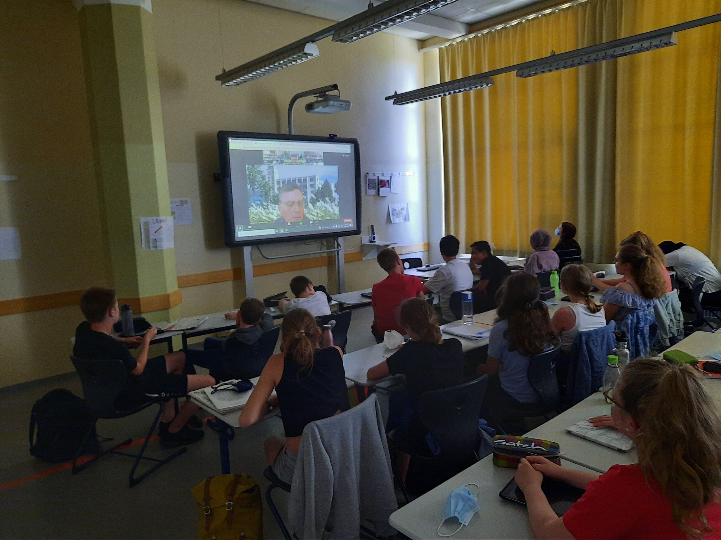 Digitaler Unterricht mit dem Lehrer, als Schülervertreter digital an Fachkonferenzen teilnehmen und auch gelegentlich private Gespräche in Break-out-Räumen - das sind unsere Schülerinnen und Schüler aus den letzten Wochen und Monaten mehr als gewohnt. Doch eine Videokonferenz mit dem Bürger war dann doch noch etwas besonderes und so saßen die Achtklässlerinnen und Achtklässler gespannt vor dem Activboard, als sich der Bürgermeister Thomas Berling in den letzten zwei Wochen an verschiedenen Terminen den Lernern vorstellte.