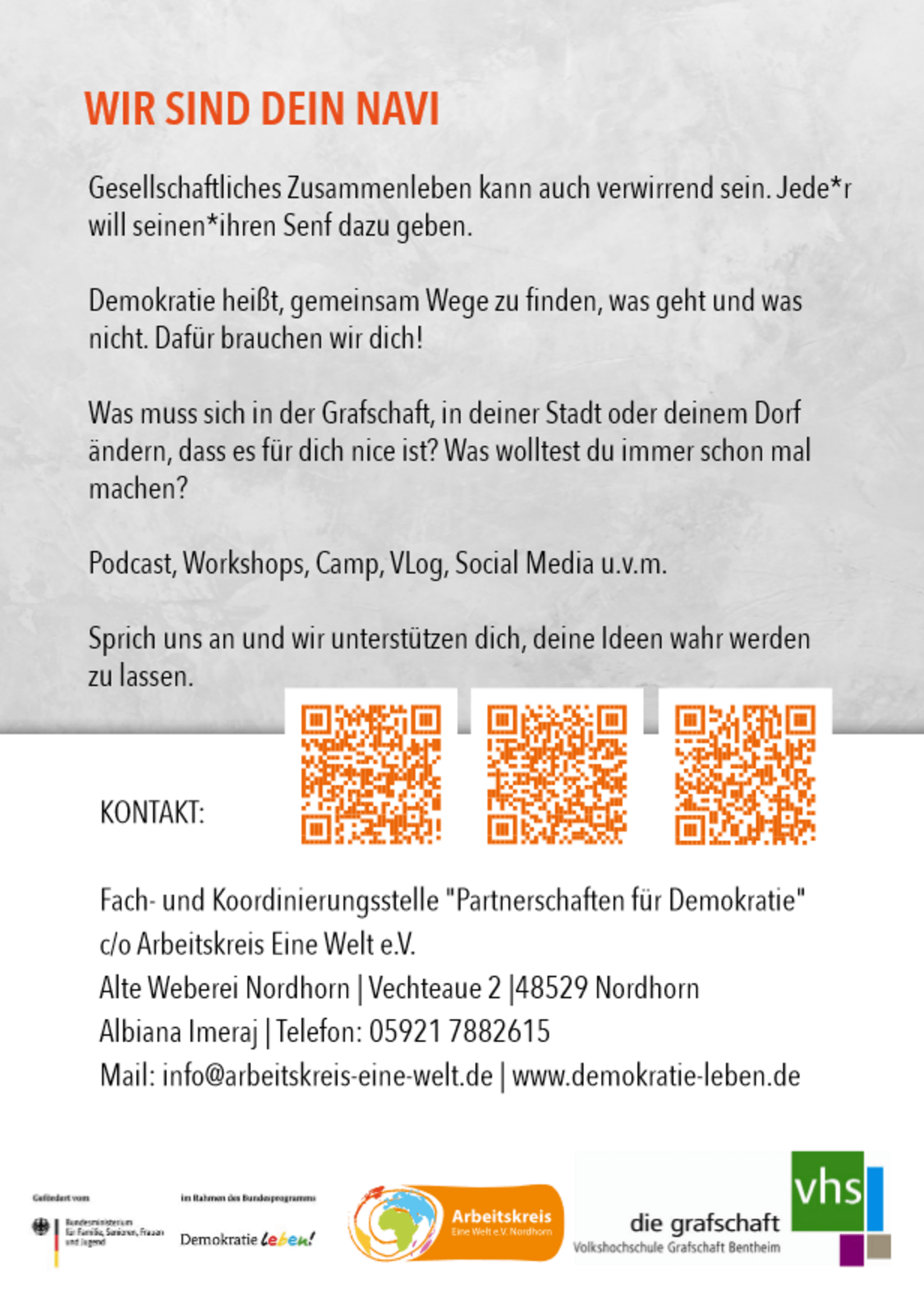In der vergangenen Woche besucht Abiana Imeraj vom Arbeitskreis eine Welt e.V.verschiedene Klassen des EGN um das Projekt Partnerschaft für Demokratien vorzustellen. Mit diesem sollen Jugendliche ermutigt werden, sich für eine Stärkung der demokratischen Strukturen im Nahbereich einzusetzen und dabei sowohl in der Planung als auch der finanziellen Umsetzung unterstützt. In einer Präsentation wurden die Schülerinnen und Schüler über die verschiedenen Möglichkeiten aufgeklärt und erste Ideen auch direkt diskutiert.