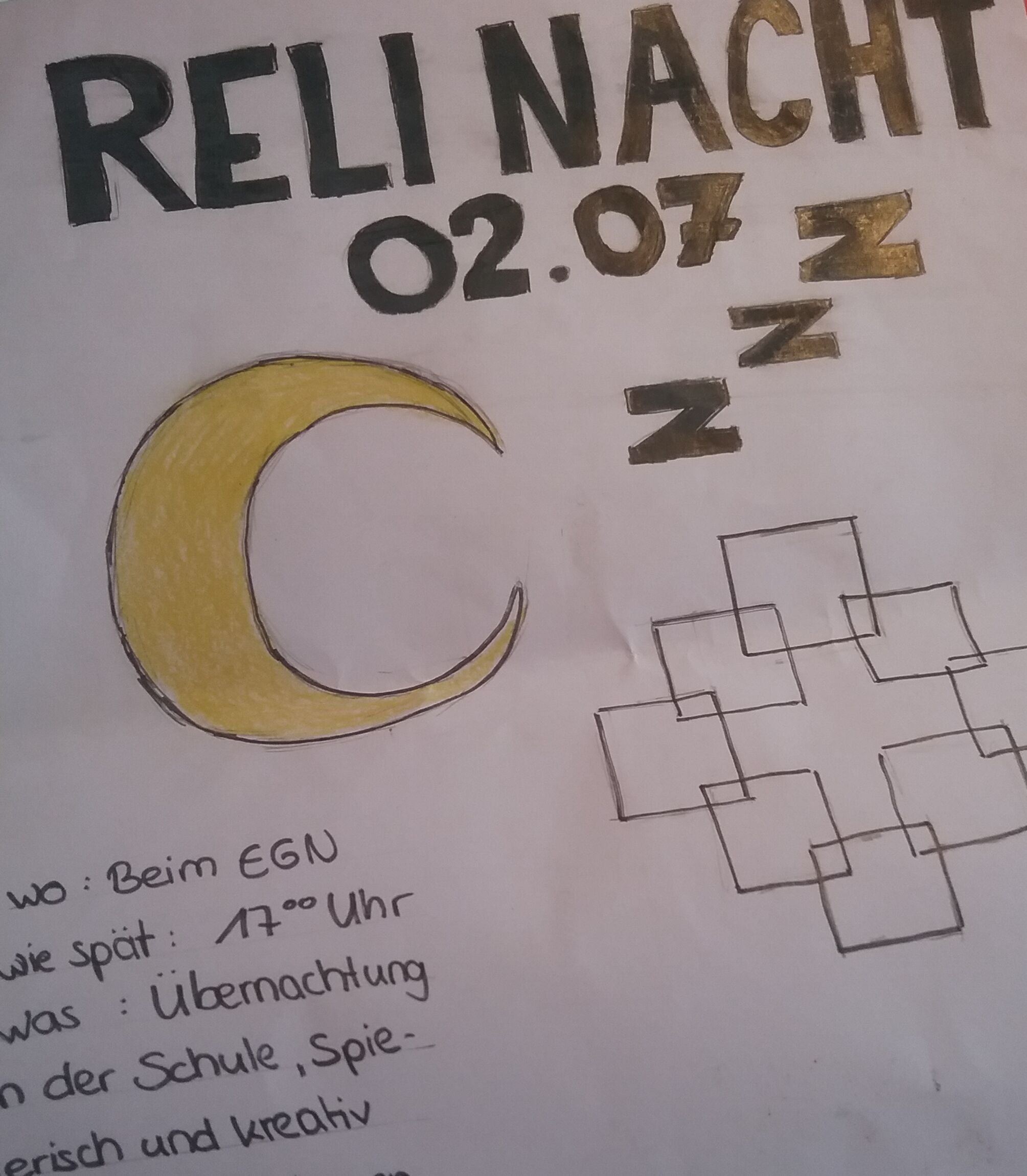 Die Klasse 9c bereitete sich im Unterricht auf die Durchführung der 2. Reli-Nacht für die Schülerinnen und Schüler der 5. Klassen vor. Schnell war klar, dass das Thema ein grundlegendes sein würde und so konzentrierte sich die Klasse auf das Thema „Jesus - wir erklären Dir seine Welt“, überlegte sich spannende Themenbereiche und entwarfen Workshopideen, um den fünften Klassen die Lebenswelt Jesu und die Bedeutung von Jesus für uns heute spielerisch näherzubringen.